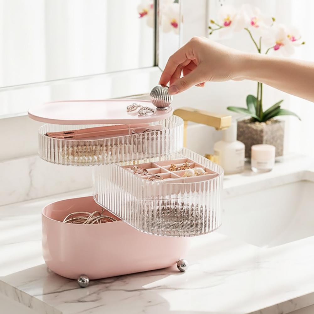 Minden ékszerkedvelő tudja, hogy sosem lehet belőlük elég. Ezzel azonban egy kis probléma is jár – hová helyezzük el őket úgy, hogy ne csak rend legyen bennük, hanem legfőképpen ne sérüljenek meg? Azok számára, akik értékeiknek szeretnének egy olyan teret biztosítani, ahol megvédhetik őket a külső hatásoktól, és ugyanakkor kéznél vannak, megvan ez a gyönyörű ékszerdoboz. Elegáns és áttekinthető, szép és kiváló a forgatható rekeszeinek köszönhetően, ilyen ez a háromszintes ékszerdoboz, amely biztonságosan őrzi meg láncait, karkötőit, fülbevalóit, gyűrűit, sőt óráit és brossait is. Bármelyik pipereasztalon kitűnik, és egy csipetnyi luxust kölcsönöz neki. Klasszikus megjelenését azok is értékelni fogják, akik szeretik a minimalizmust, mivel visszafogott púderrózsaszín színt kombinál ezüst részletekkel és átlátszó bordázott rekeszekkel.