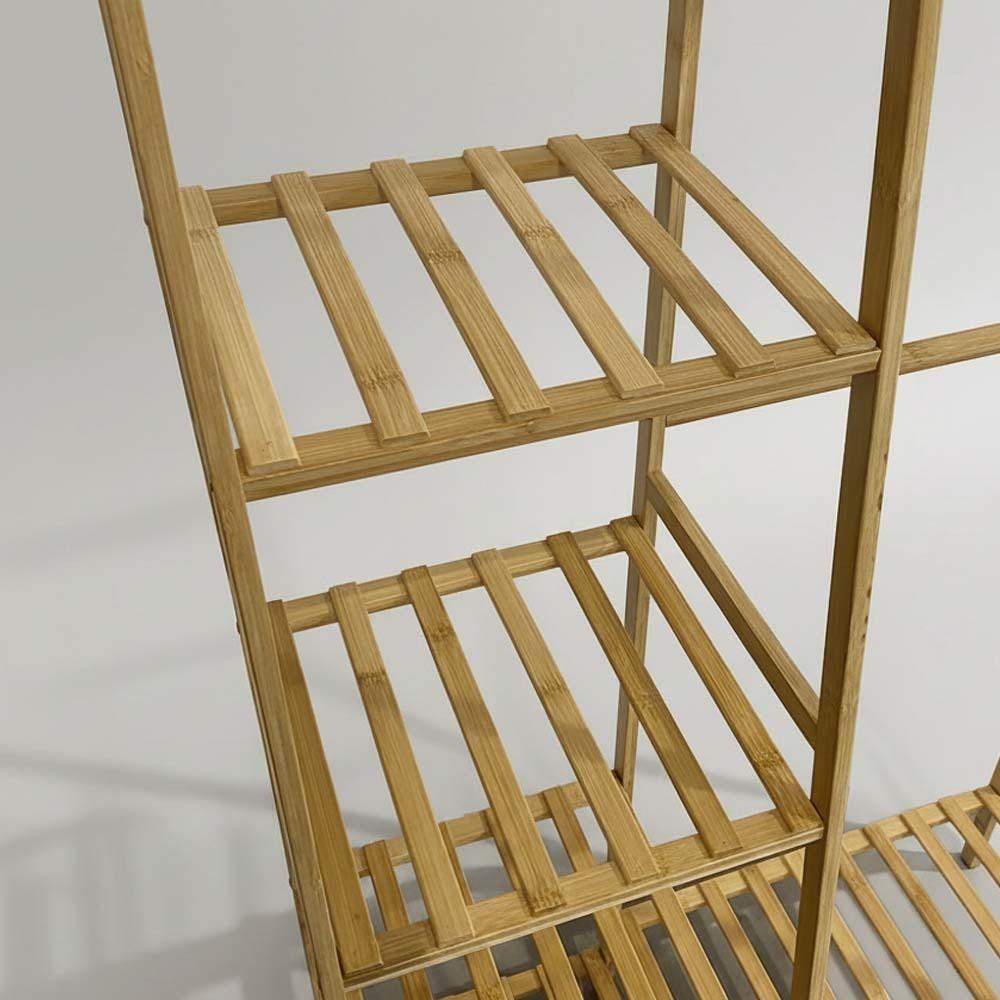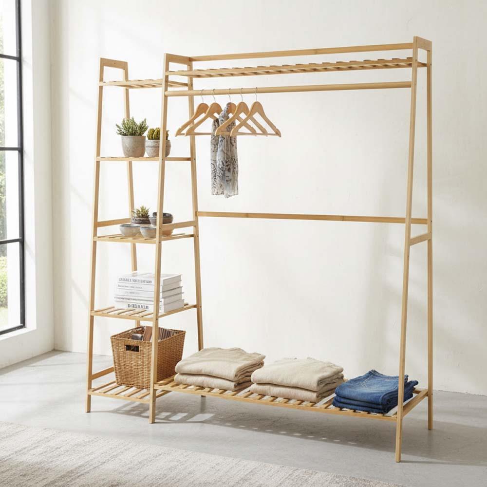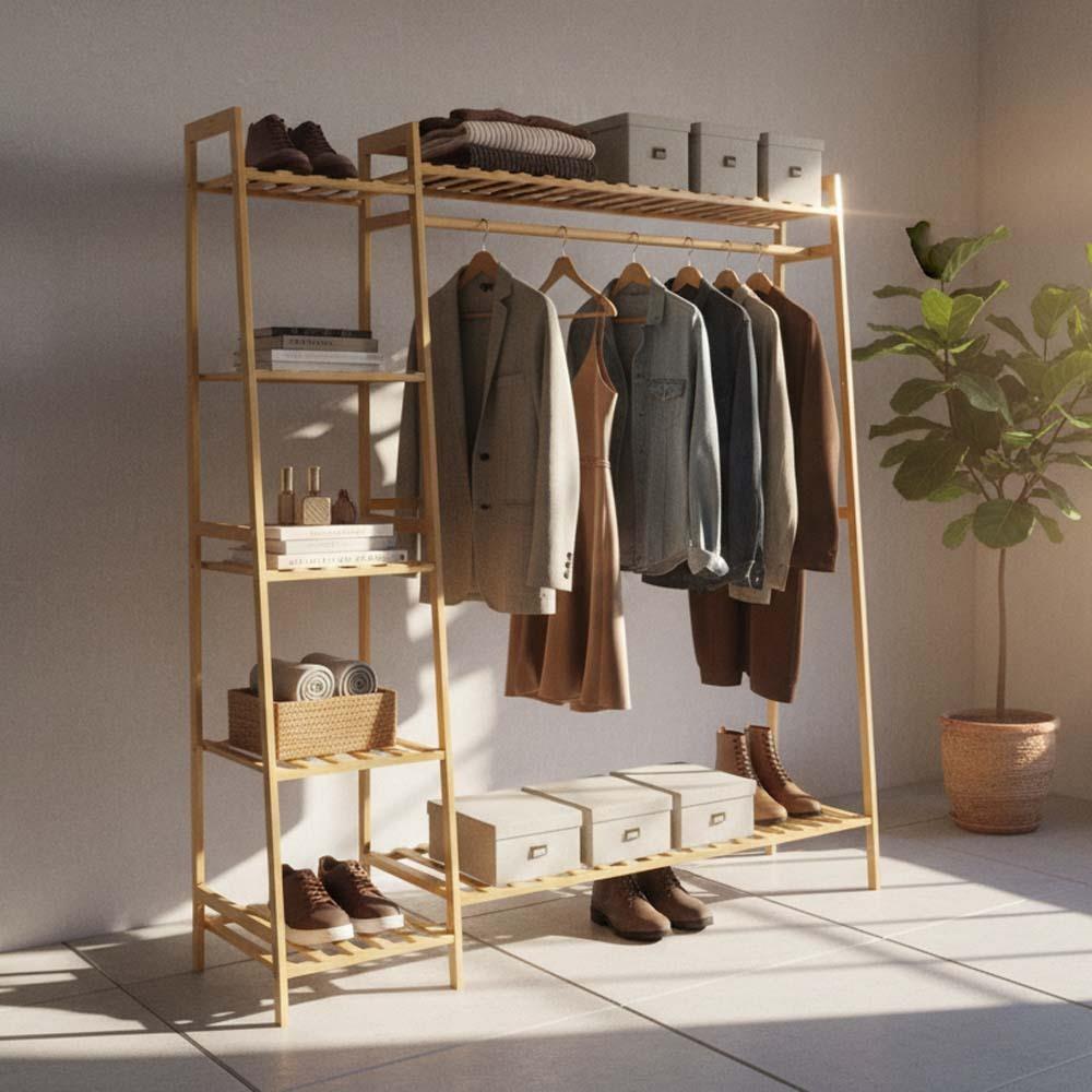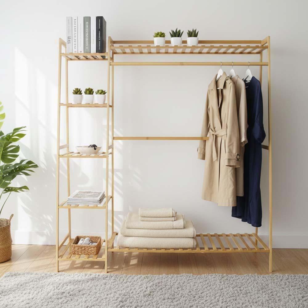A bambusz ruhatartó állvány ideális megoldás mindenkinek, aki szeret rendet tartani a holmijai között. Ötvözi a praktikus fogast a polcokkal, így könnyedén rendszerezheti ruháit és kiegészítőit. Minden átláthatóan egy helyen lesz. A természetes design otthonos hangulatot kölcsönöz a belső térnek, és remekül illik a hálószobába, gardróbba vagy előszobába is. Mindennapi használatra elegendő helyet kínál.