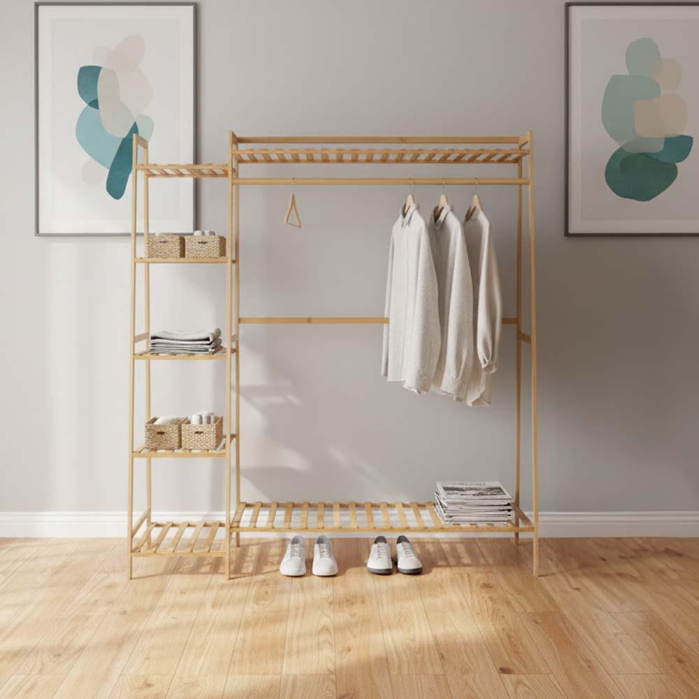 Bambusz ruhatartó állvány polcokkal és akasztóval – 130 cm széles