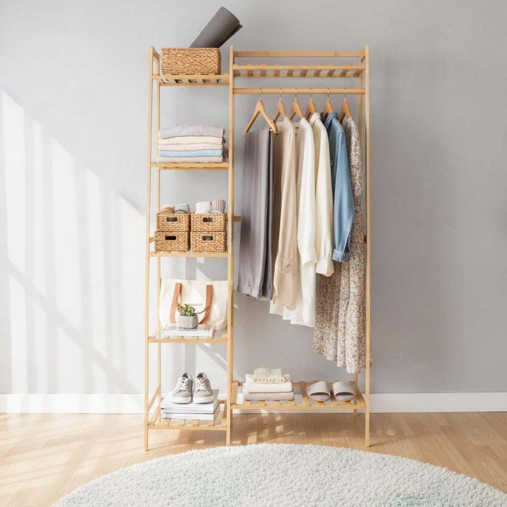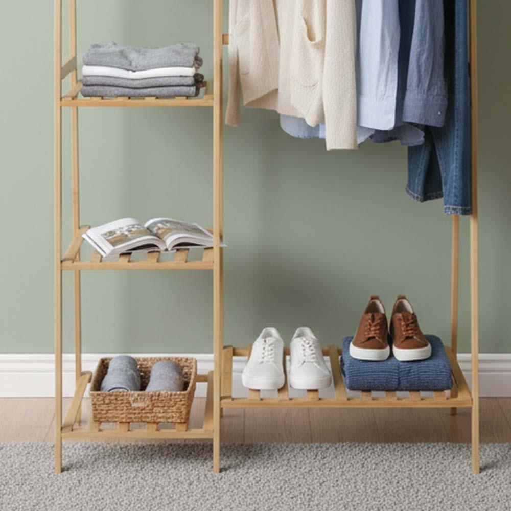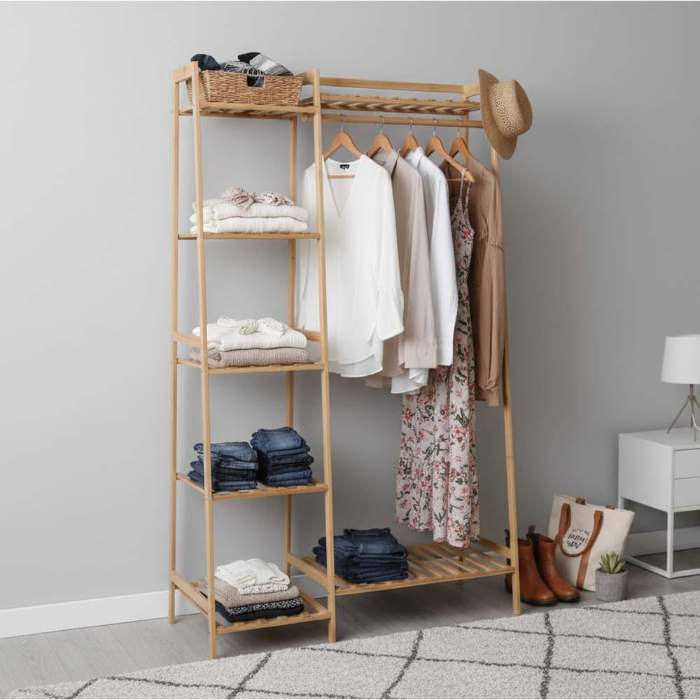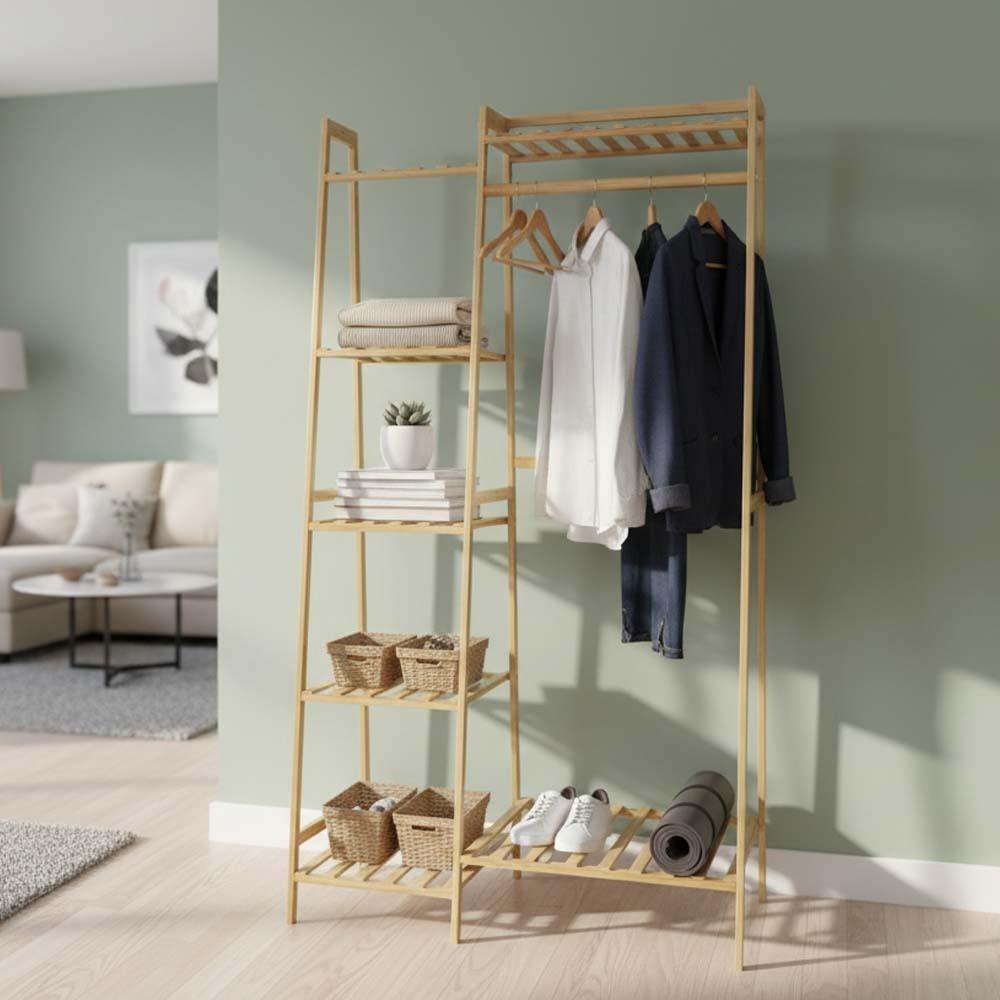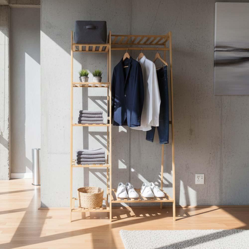 A bambusz ruhatartó állvány ideális megoldás mindenkinek, aki szeretne rendet tartani a holmijai között. Egyesíti a praktikus akasztót a polcokkal, így könnyedén rendszerezheti ruháit és kiegészítőit. Minden áttekinthetően, egy helyen lesz elérhető. A természetes dizájn otthonos hangulatot kölcsönöz a belső térnek, ezért tökéletes választás hálószobába, gardróbba vagy előszobába is. Mindennapi használatra elegendő helyet kínál.