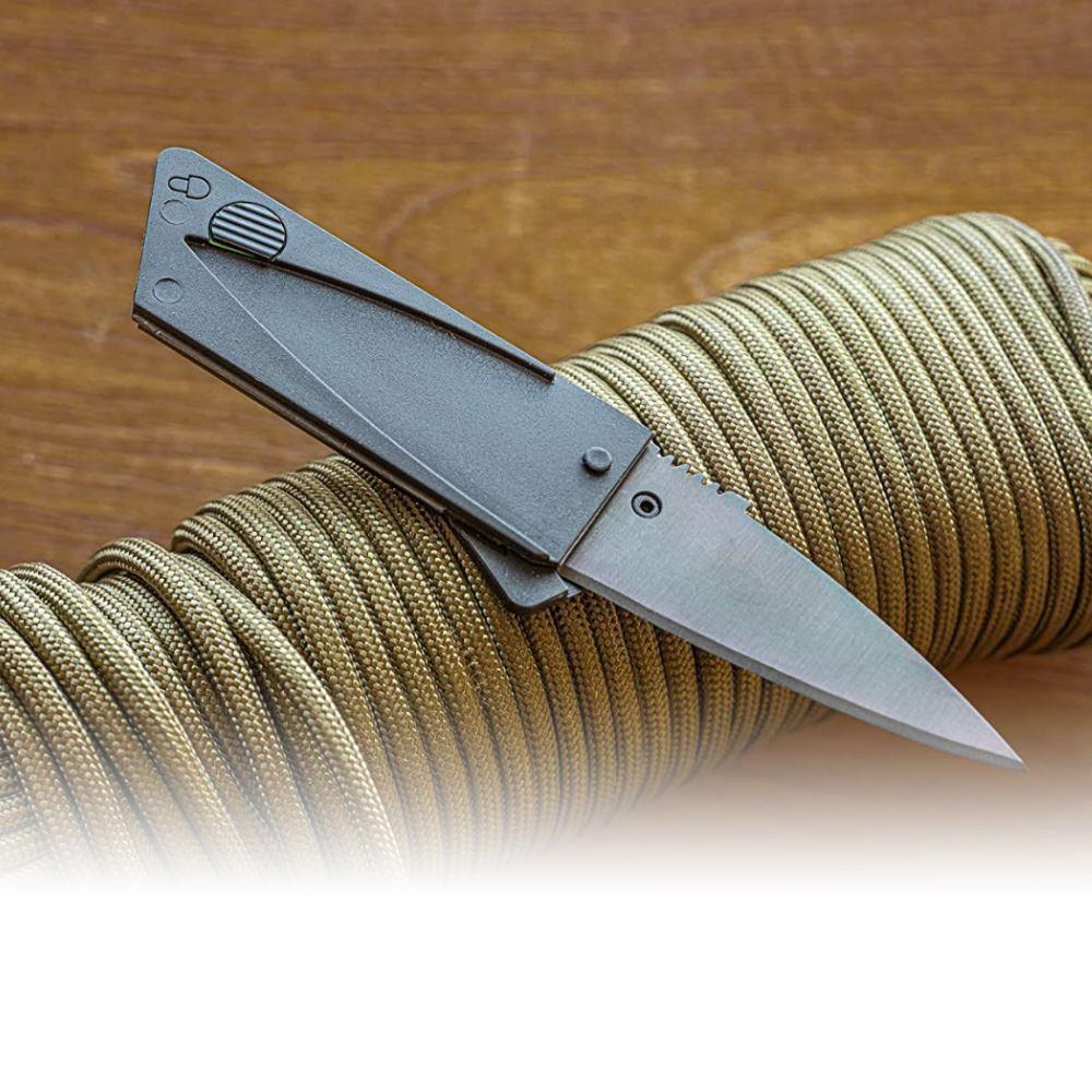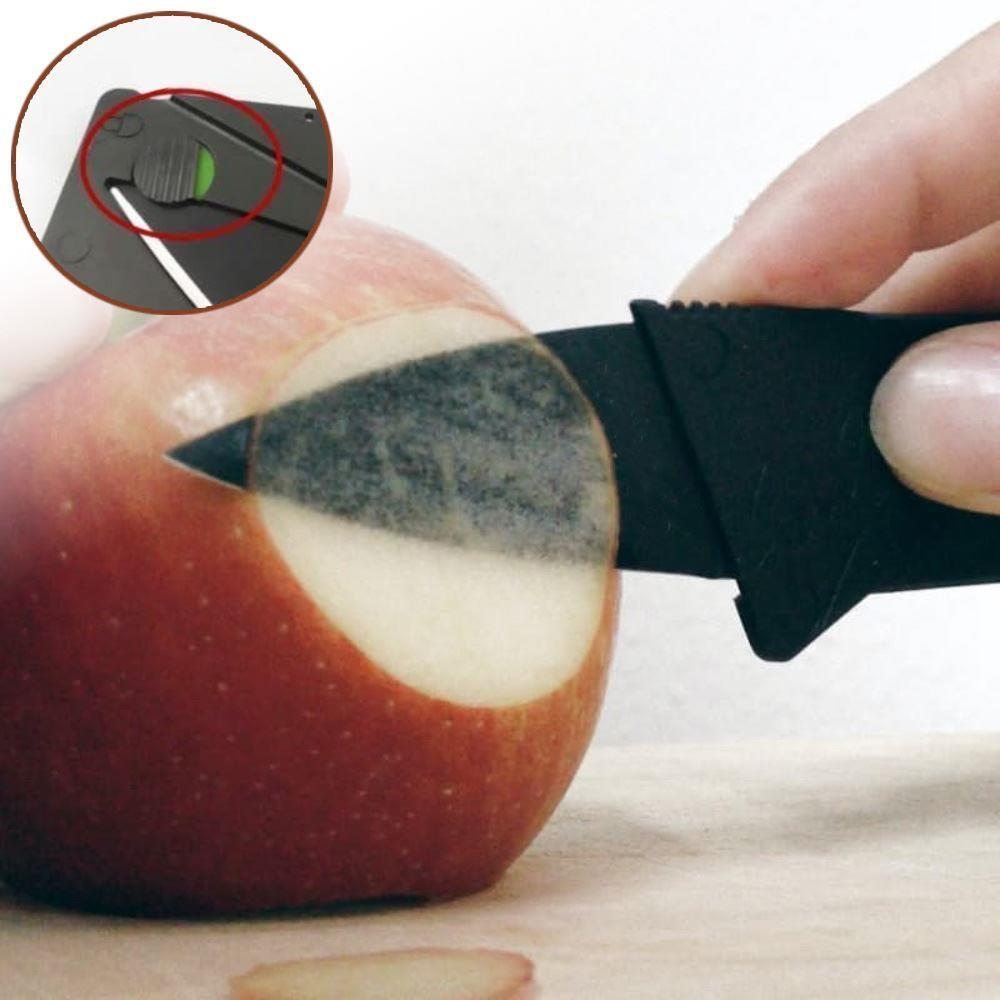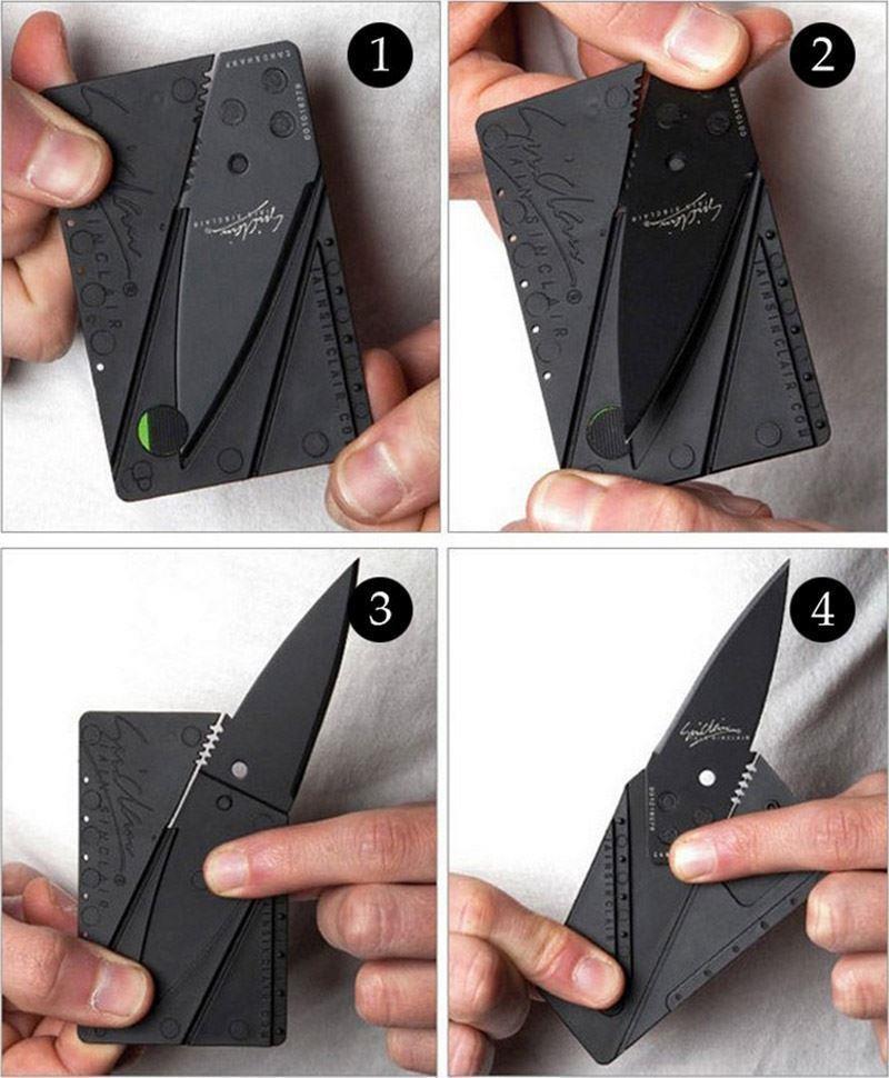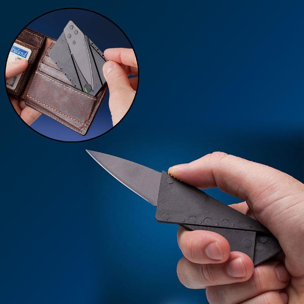 Ez a praktikus kis kés egy hitelkártyában lett elrejtve és megtervezve, így mindig magadnál hordhatod. Egyáltalán nem foglal helyet, és rendkívül könnyű. Szükség esetén könnyen szétnyitható, majd ismét összecsukható. A kártyán tökéletesen kidolgozott biztonsági zár található, így nem kell attól tartanod, hogy a kés véletlenül kinyílik. Csak akkor nyílik ki, ha te szeretnéd.