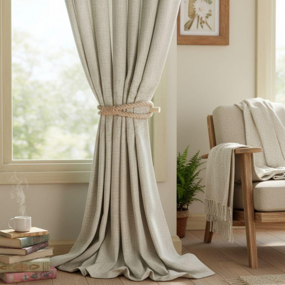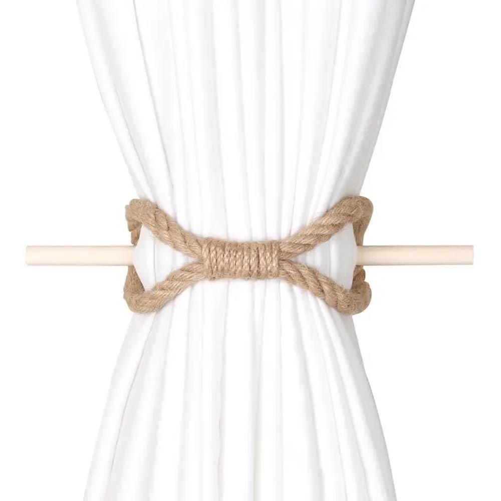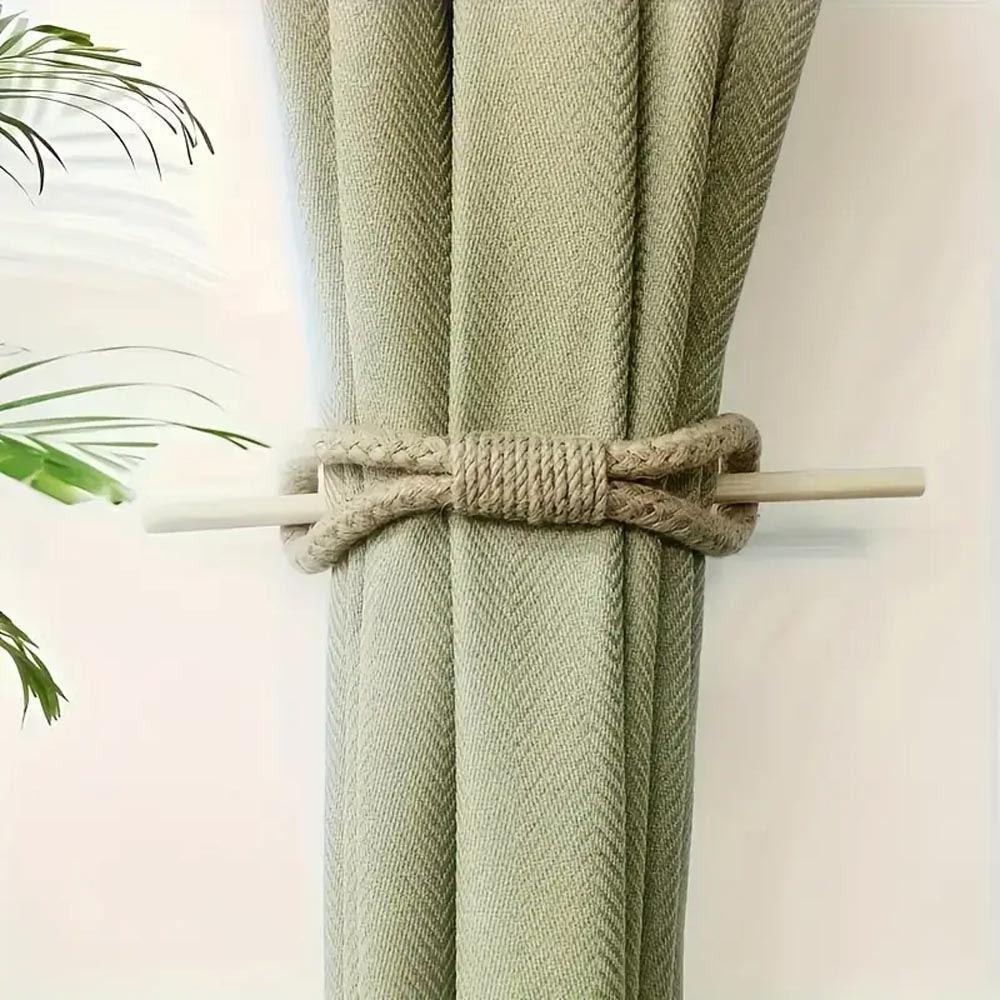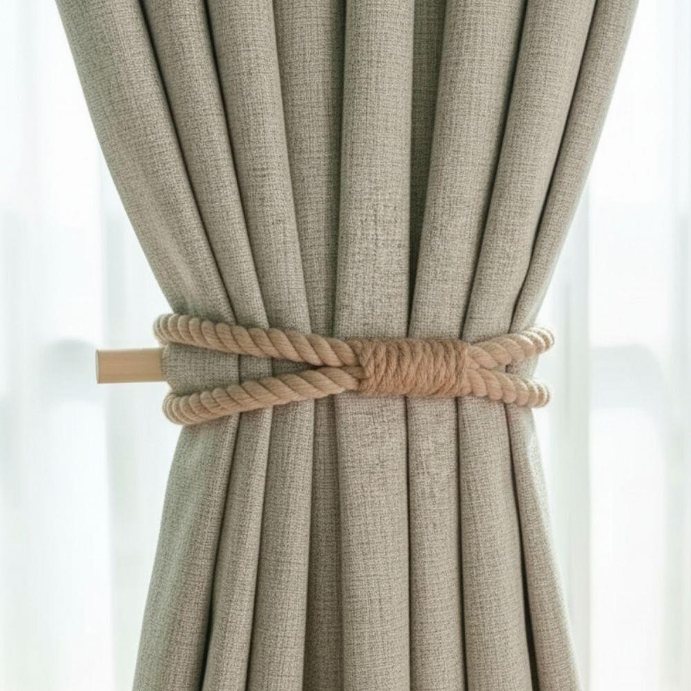 Ez a kapocs nemcsak praktikus módon tartja a függönyöket a helyükön, hanem egyben hangsúlyos dizájnelemként is szolgál, amely teljesen új megjelenést kölcsönöz a térnek. A telepítés nagyon egyszerű – csak tekerje körbe a kötelet a függönyön, és rögzítse a fa rúddal.
