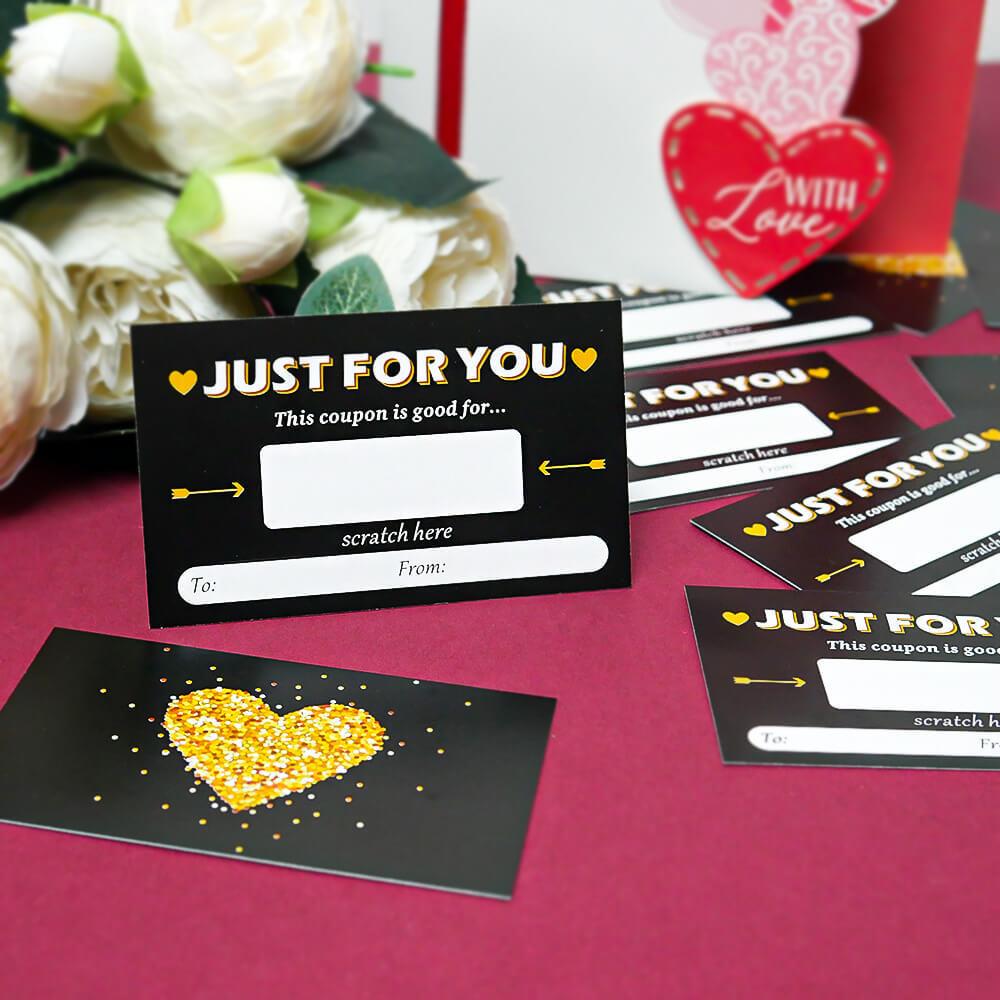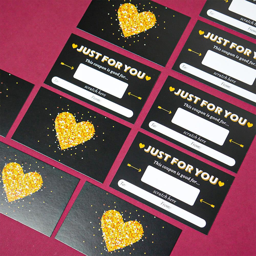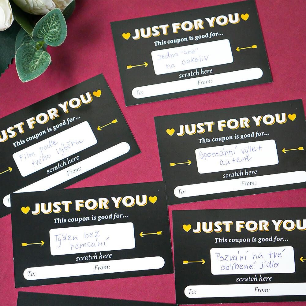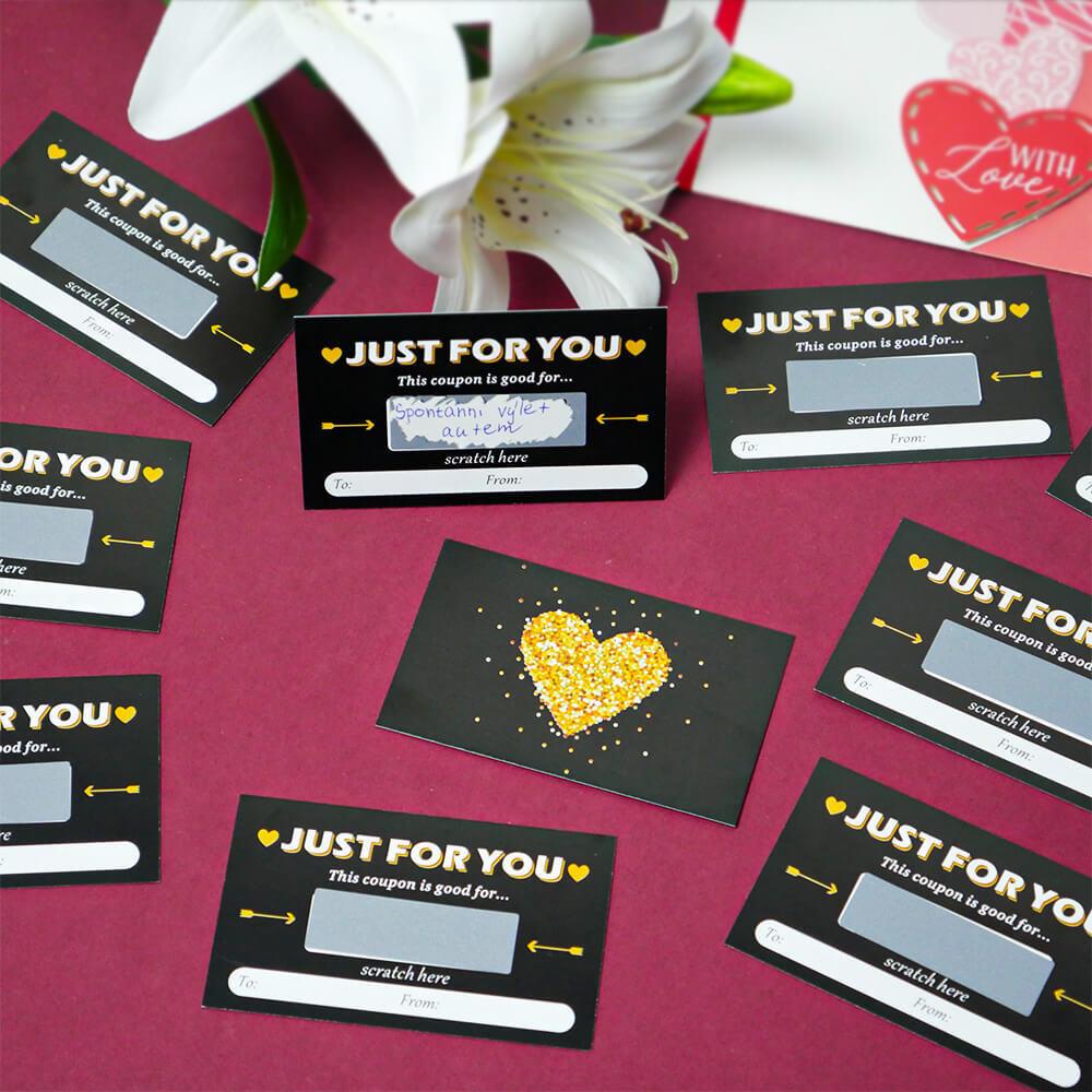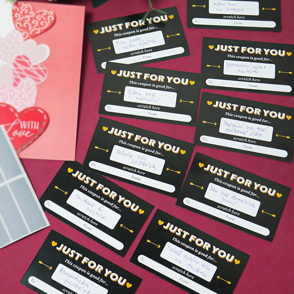 Minden kuponra eredeti kívánságot írhatsz, például masszázst, ágyba hozott reggelit, romantikus sétát vagy közös nyaralást. Ezután egyszerűen lefeded a mezőt egy kaparós matricával, így egy kis titkot rejtegetsz, amely arra vár, hogy leleplezzék. Játékos formájának köszönhetően az üzenet sokkal személyesebb és szívhez szólóbb. Egy csomagban tíz sorsjegy található, így több embert is meglephetsz, vagy egy különleges személy számára készíthetsz sorozatos apró meglepetéseket. Minden sorsjegy egyedi, mert beleteszed a saját személyiséged. Ez az az érték, amit egy vásárolt ajándék sosem pótolhat.