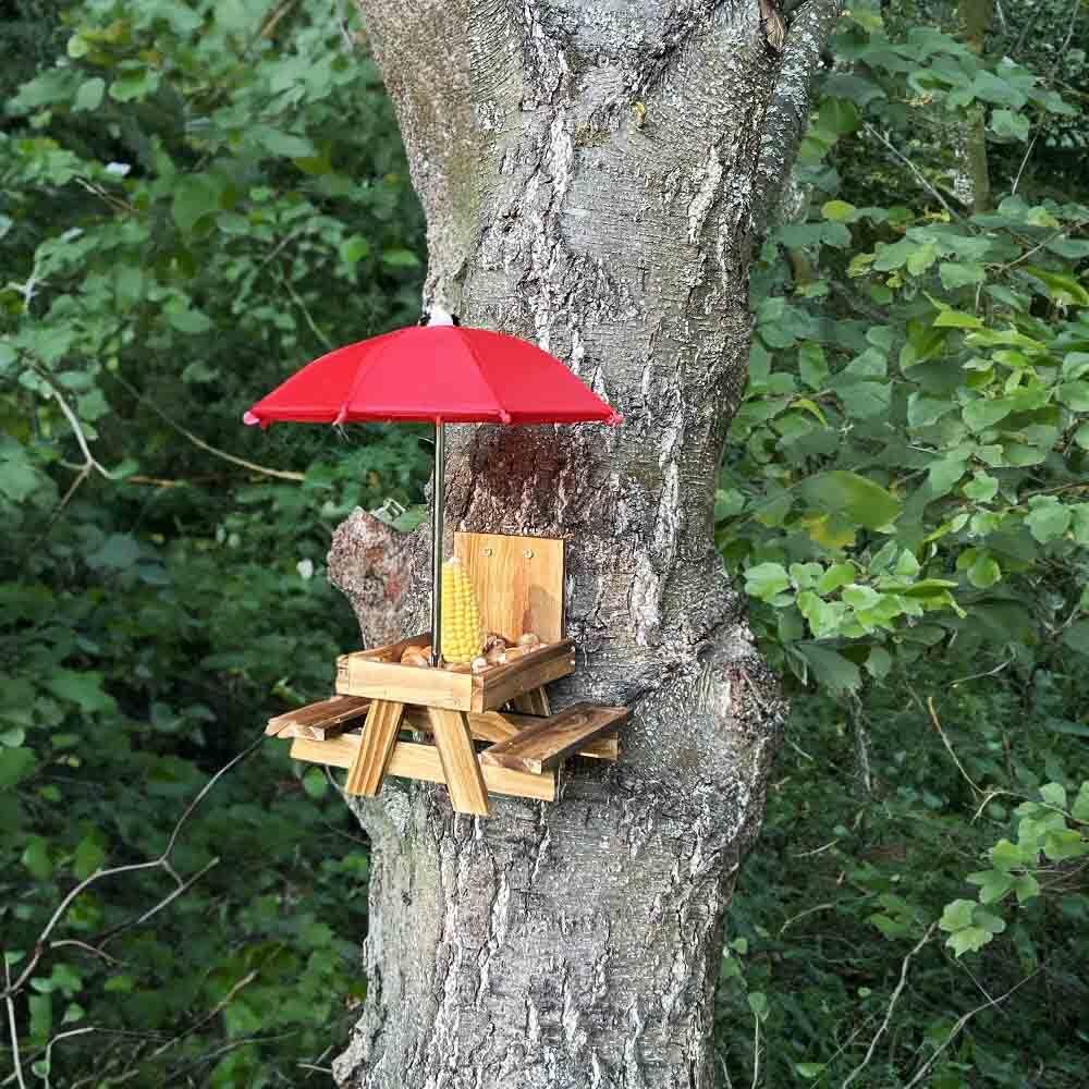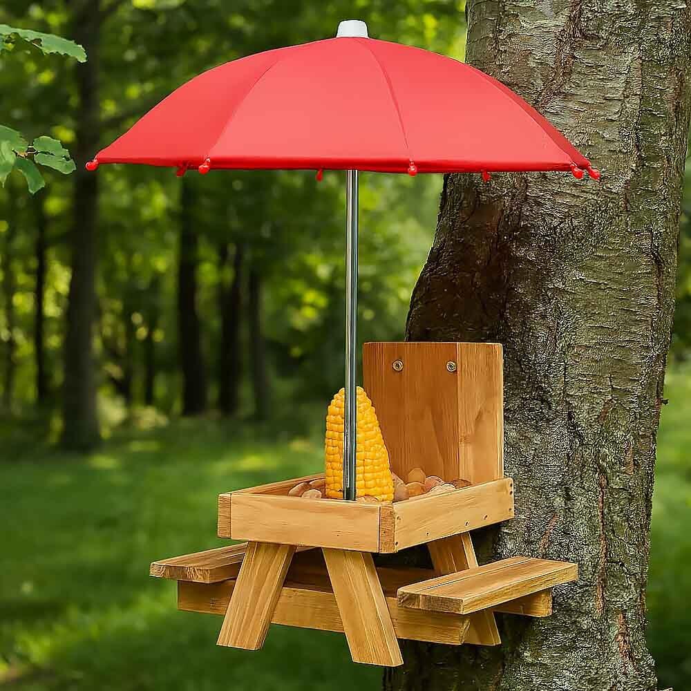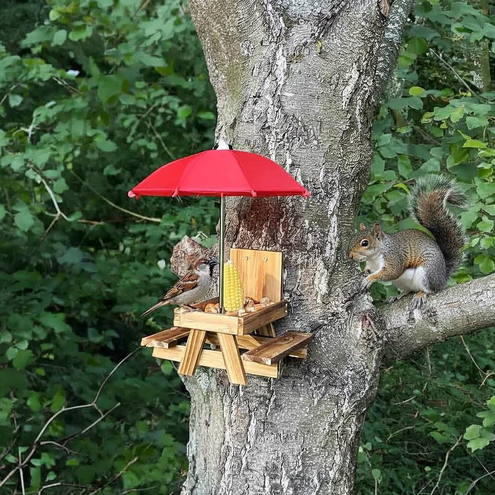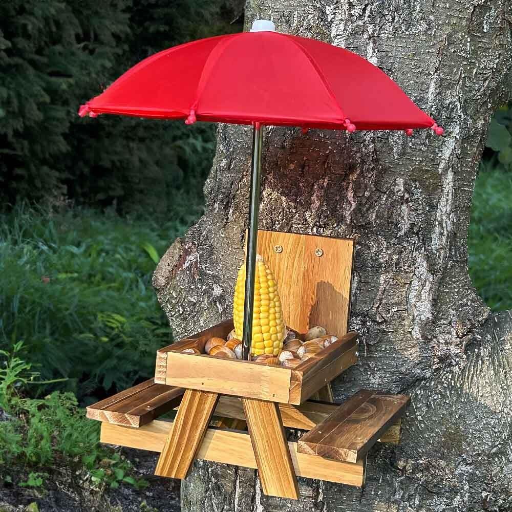 Ön is szívesen kedvez a madaraknak, akik ellátogatnak a kertjébe, az erkélyre vagy a teraszra? Ha igen, bizonyára van otthon madáretetője, amelybe finomságokat szór nekik. A piacon rengeteg található, mi azonban bemutatunk egy olyat, amellyel az állatok megfigyelése még szórakoztatóbb lesz! A vidám fa etető piknikasztalhoz hasonlít, és még egy esernyő is jár hozzá! A madarak, mókusok és más állatok így egy vicces kis piknikező helyen élvezhetik az ételt, amelyet az esernyő megvéd az esőtől és a nap sugaraitól. Szerezzen örömöt kis látogatóinak, helyezze például a kerítésre, és figyelje, hogyan csemegéznek azokból a finomságokból, amelyeket az asztalra terítettek nekik. Így egy kicsit közelebb kerülhet a természethez, és az állatok megfigyelése egy csésze finom kávé mellett megnyugtatja lelkét és szebbé teszi a napot.