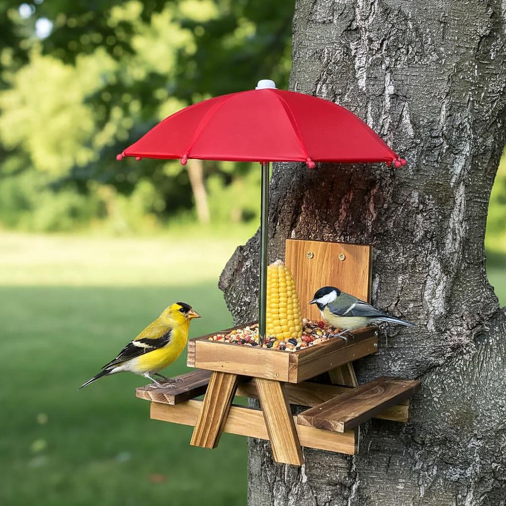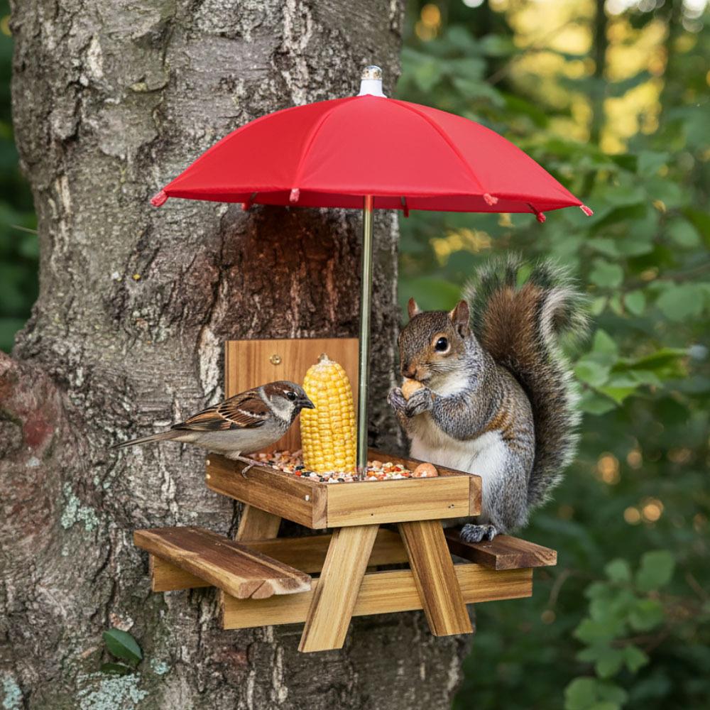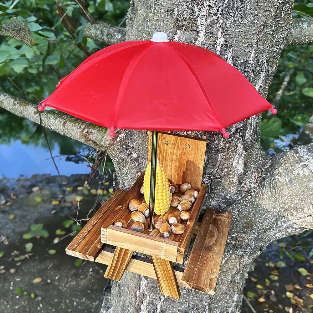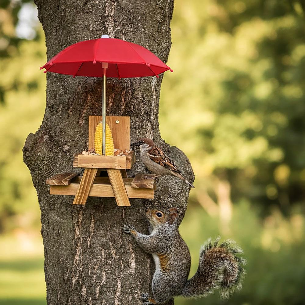 Ön is szívesen kedvez a madaraknak, akik ellátogatnak a kertjébe, az erkélyre vagy a teraszra? Ha igen, bizonyára van otthon madáretetője, amelybe finomságokat szór nekik. A piacon rengeteg található, mi azonban bemutatunk egy olyat, amellyel az állatok megfigyelése még szórakoztatóbb lesz! A vidám fa etető piknikasztalhoz hasonlít, és még egy esernyő is jár hozzá! A madarak, mókusok és más állatok így egy vicces kis piknikező helyen élvezhetik az ételt, amelyet az esernyő megvéd az esőtől és a nap sugaraitól. Szerezzen örömöt kis látogatóinak, helyezze például a kerítésre, és figyelje, hogyan csemegéznek azokból a finomságokból, amelyeket az asztalra terítettek nekik. Így egy kicsit közelebb kerülhet a természethez, és az állatok megfigyelése egy csésze finom kávé mellett megnyugtatja lelkét és szebbé teszi a napot.