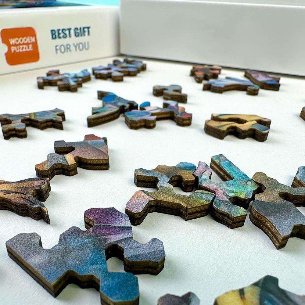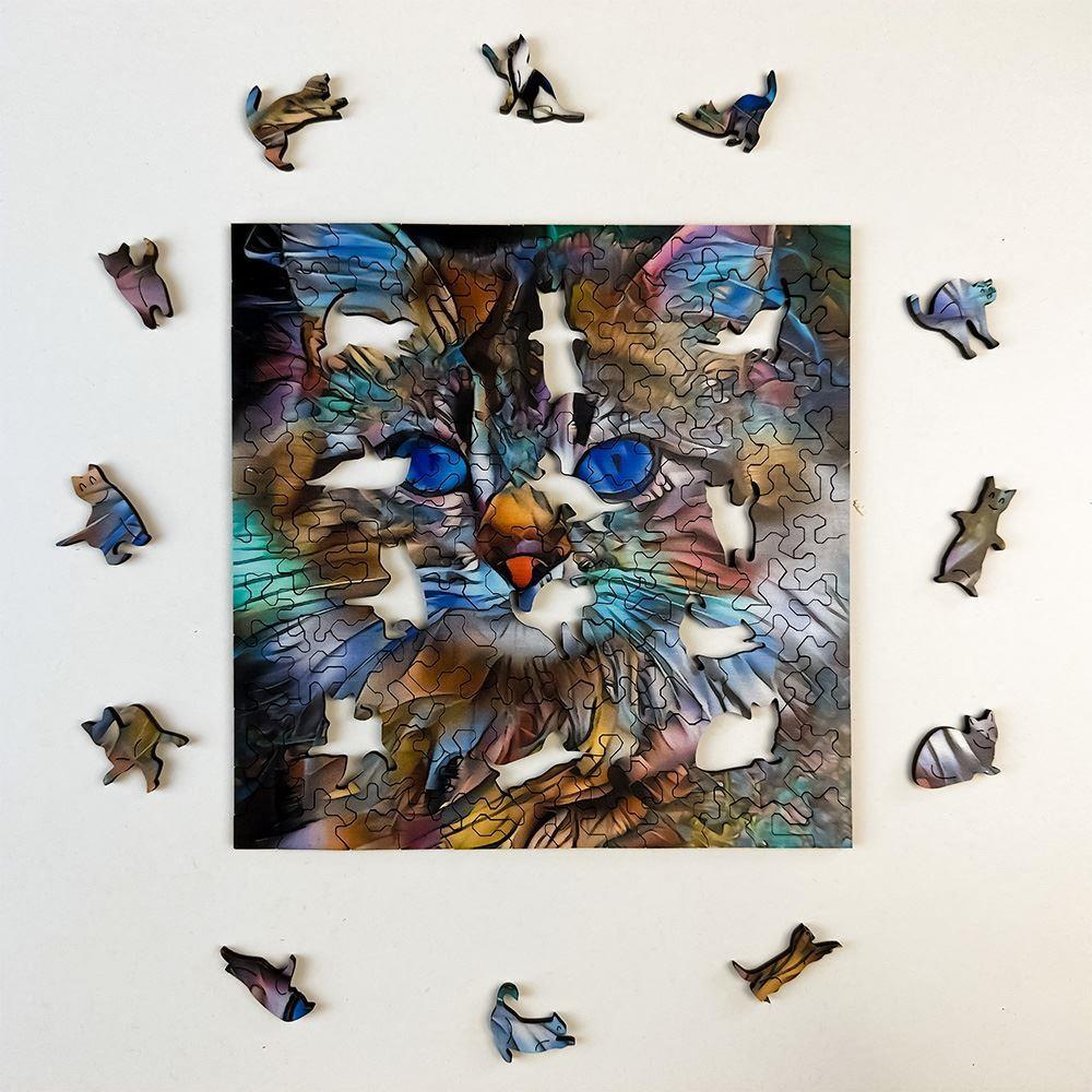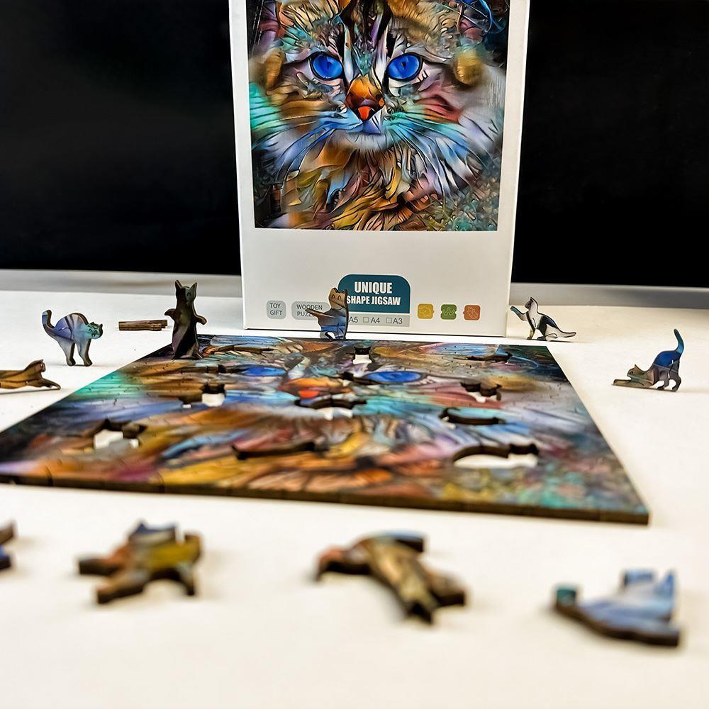 A kirakó vidám, színes nyomattal rendelkezik. A fából készült anyagnak köszönhetően, bekeretezve gyönyörű cicás kép készíthető belőle otthonába.
