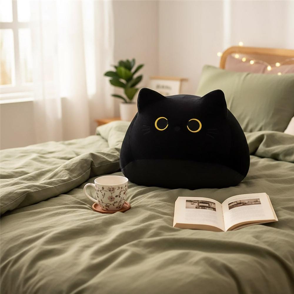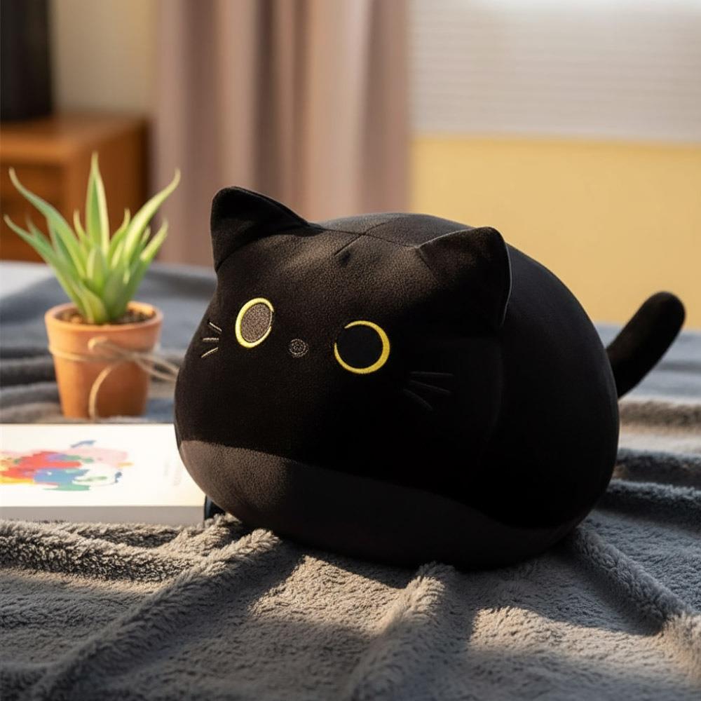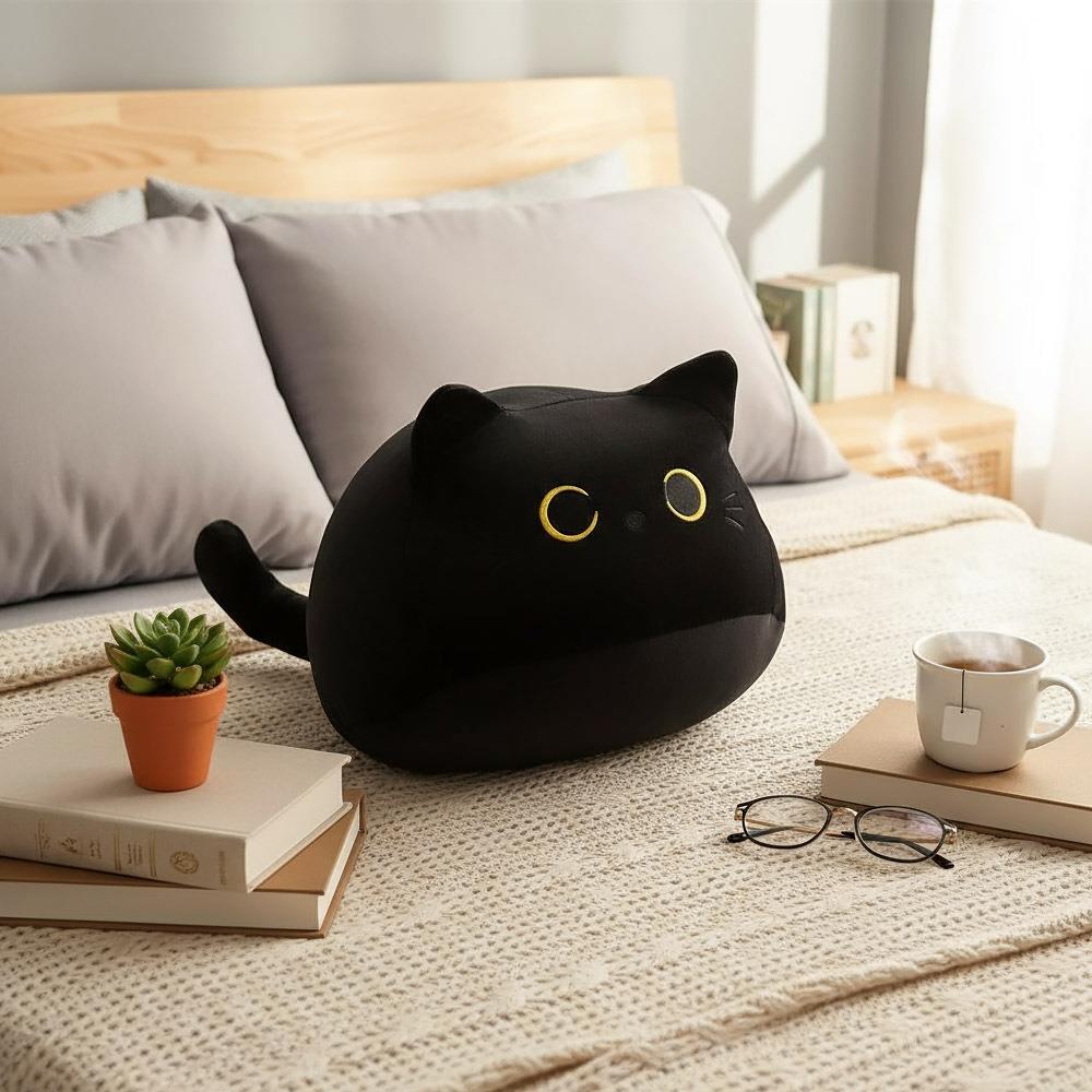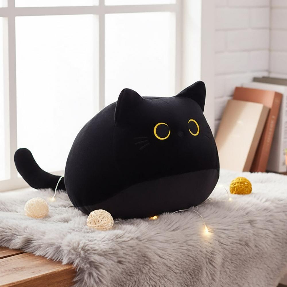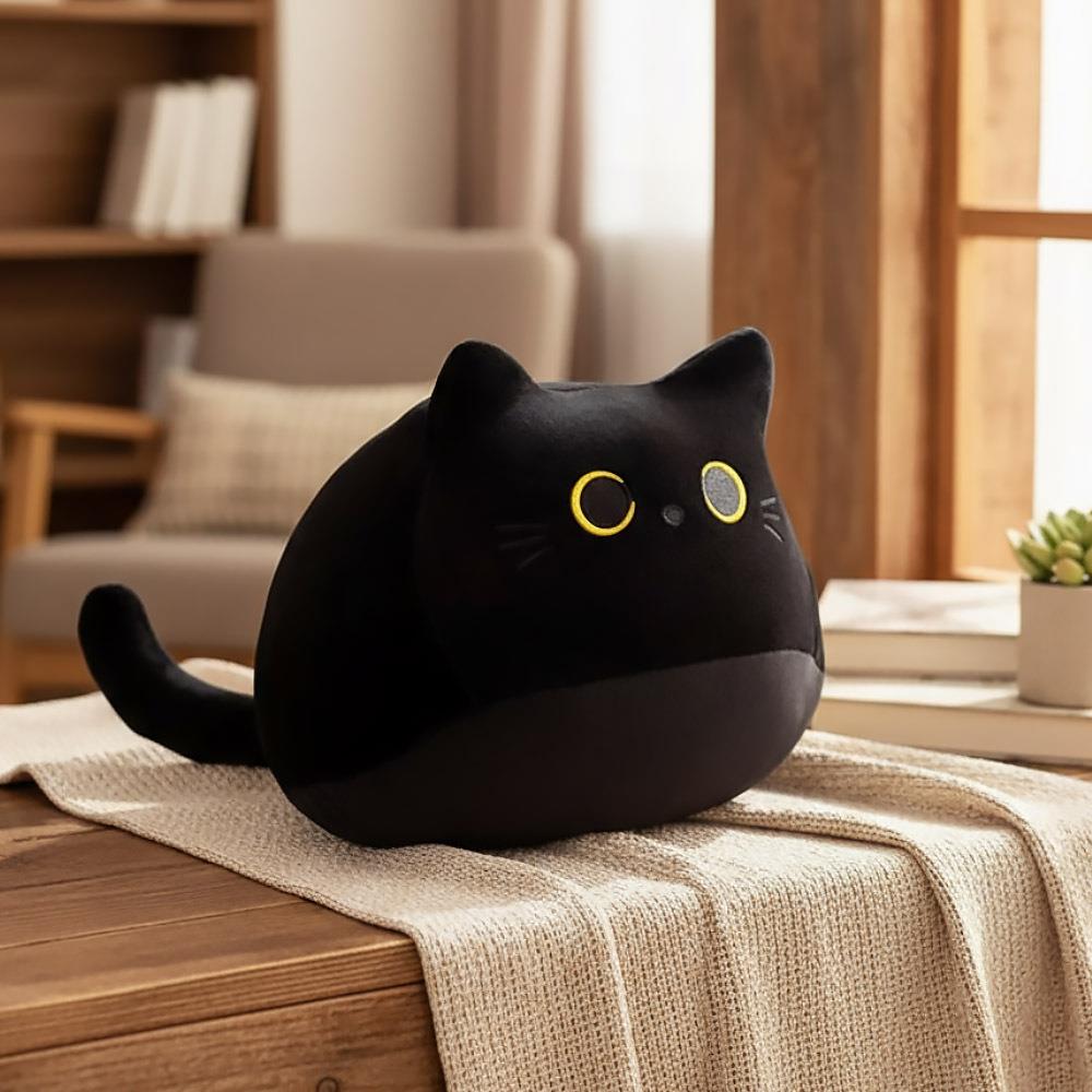 A fekete plüssmacska párna kedves fülekkel és farokkal minden cicabarátot és állatkedvelőt boldoggá tesz. Alkalmas dekorációként a belső tér felfrissítésére, fej alá helyezhető párnaként a pihenéshez, de játékként is.