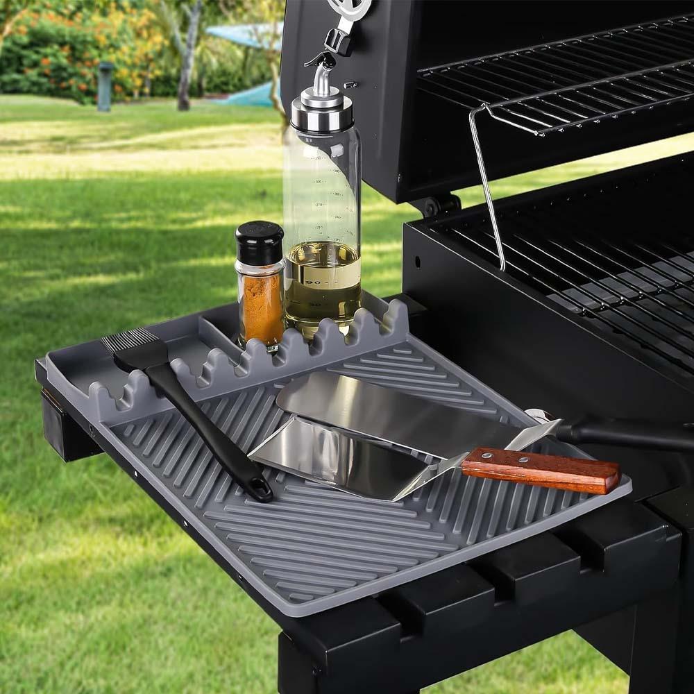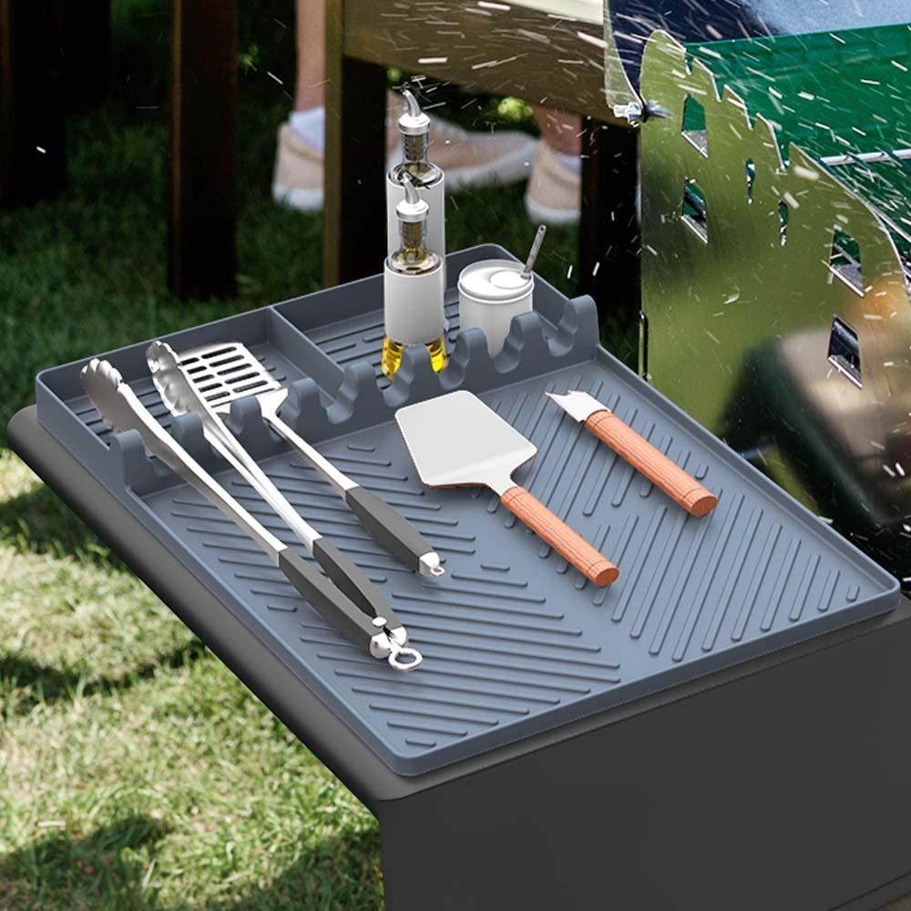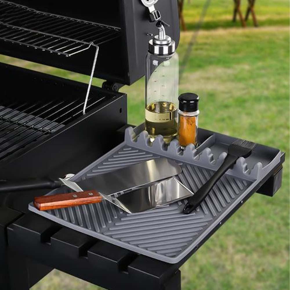 A szilikon grillalátét ideális segítőtárs mindenkinek, aki szeretne rendet tartani grillezés közben. Megvédi a grill oldalsó asztalkáját a zsírtól és szennyeződésektől, amelyek az ételek készítése során keletkeznek. Így elkerülheti a hosszas takarítást minden grillezés után. Az alátét emellett egy helyen tartja az összes grilleszközt. A grillezés így kényelmesebb és hatékonyabb lesz.