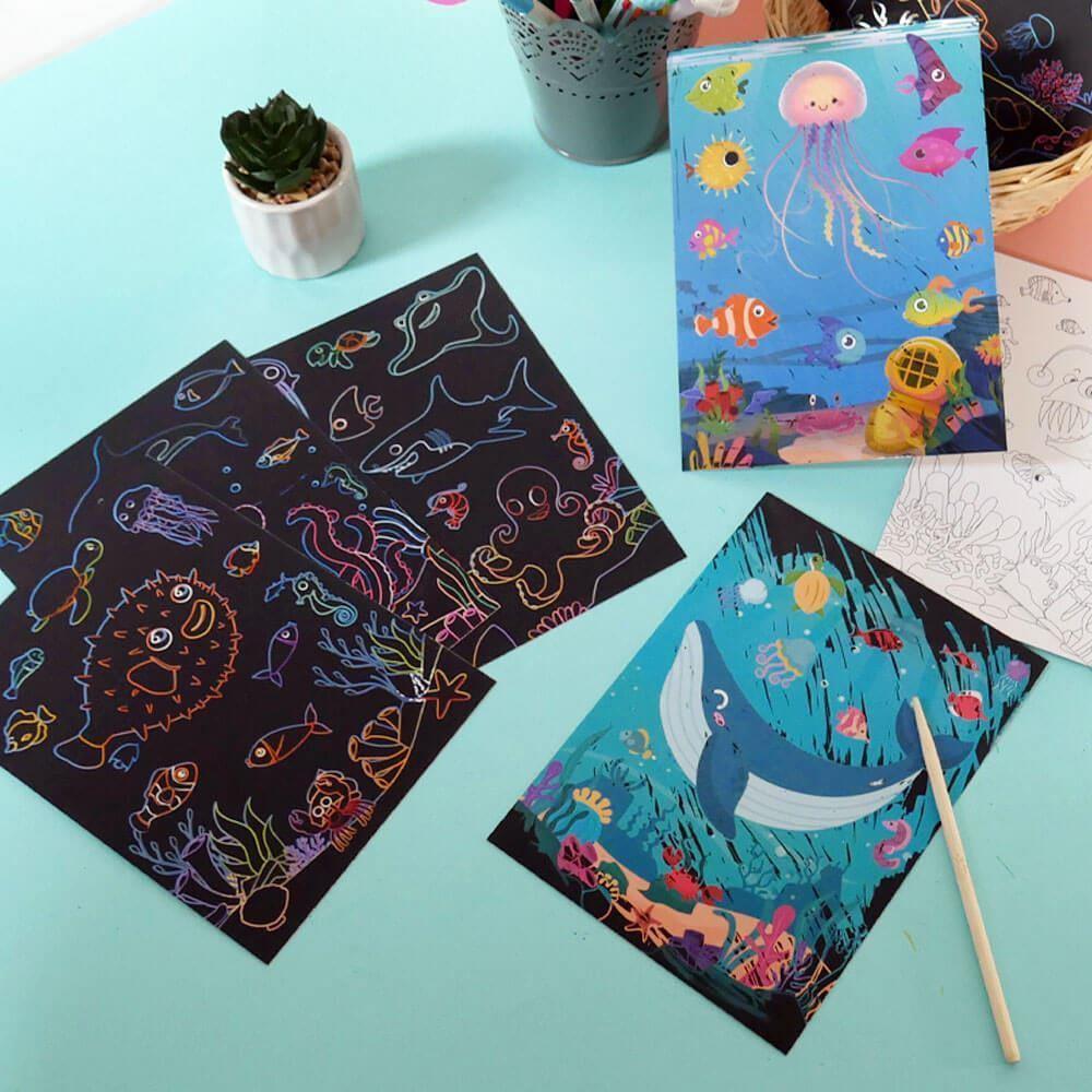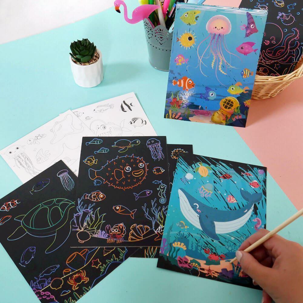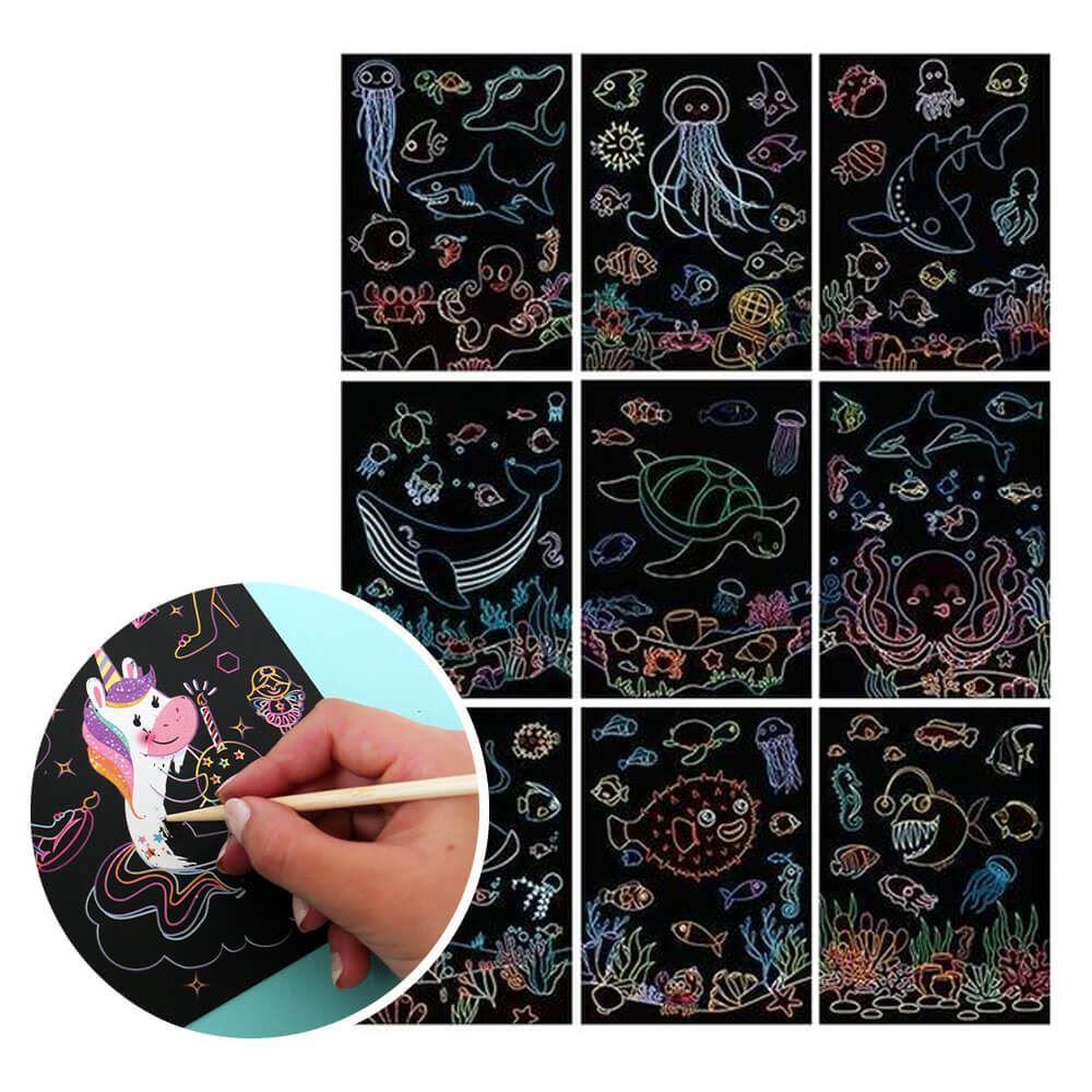 Otthon kis művészetrajongó van? Akkor ezek az eredeti kaparós színezők lesznek a tökéletes ajándék! A kaparós képek a felnőttek körében is népszerű kreatív tevékenységnek számítanak. Ezek kisebb méretben, vidám, gyerekeknek szánt mintákkal készültek. A csomag összesen 9 különböző képes lapot tartalmaz. Ezeket egy speciális tollal lehet lekaparni, amely szintén a csomag része. Kaparás közben a fekete réteg alatt vidám, lágy színek bukkannak elő. A képek kaparása során sem gond, ha a gyerekek kicsúsznak a vonalból.