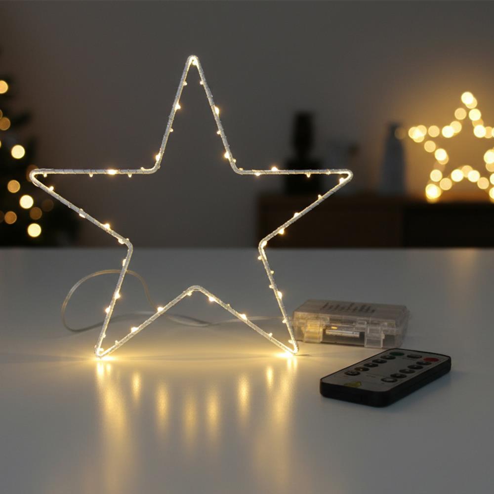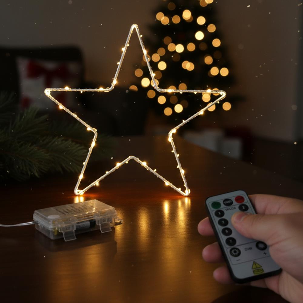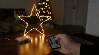A csillag távirányítóval vezérelhető. 8 világítási mód áll rendelkezésre. Szabályozható a fényerő és időzítő is - például beállítható, hogy 6 óra után kikapcsoljon.