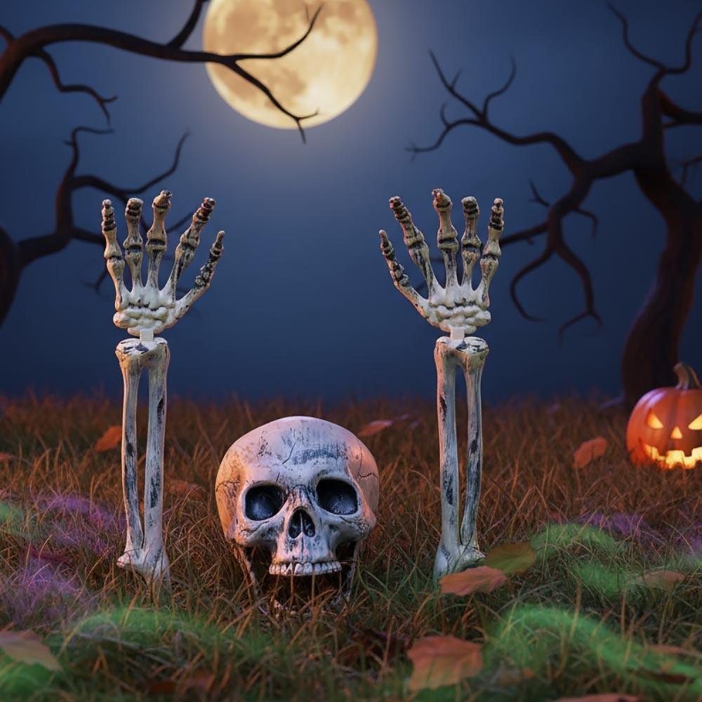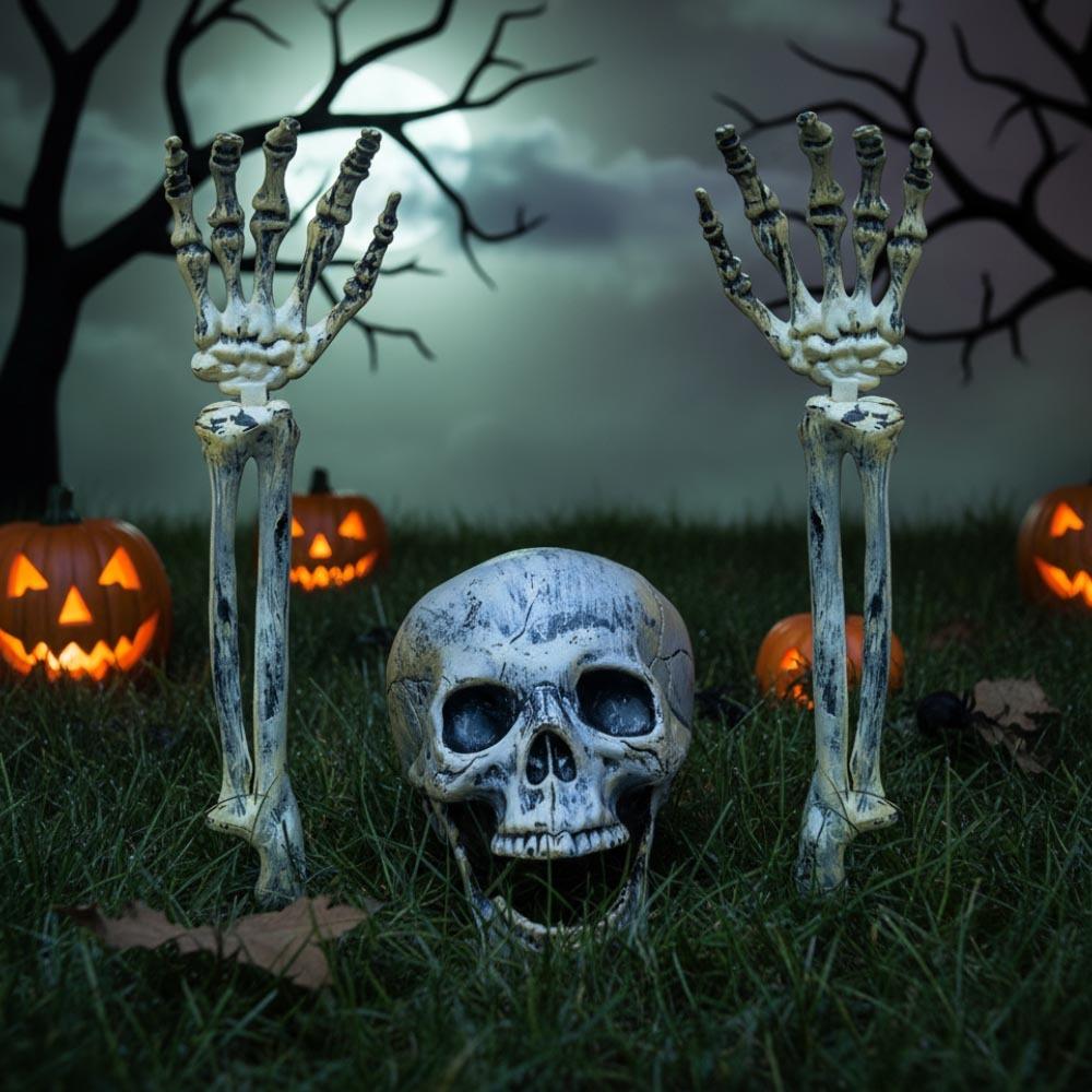 A szél fütyül a tarlón, és már a levegőben érzi, hogy ismét itt van a hátborzongató, de egyben varázslatosan szórakoztató Halloween időszaka? Ha emellett szereti a rendesen szellemes díszítést, van valami pontosan önnek! Egyszerre elrettent és szórakoztat, és ki is az? A földből kiemelkedő csontváz! A lakhelyéről kimászott a világosságra, hogy mindenkit tájékoztasson a hátborzongató ünnep érkezéséről. De ön tudja, hogy nincs mitől tartania, így a csontvázat különbözőképp elrendezheti és úgy helyezheti el, hogy az a legijesztőbb dekorációt nyújtsa. Szúrja ki például a háza felé vezető útnál, ahol üdvözli a halloweeni „trick or treat” gyermekeket, de szintén megijeszti a mit sem sejtő látogatókat. A csontváz csontos kezeit különbözően meghajlíthatja, vagy a mosolyát módosíthatja az állkapcsok mozgatásával. Néhány ízléses kiegészítőt is adhat hozzá, például kalapot, és valamit adhat a kezeibe, hogy látható legyen, a csontváz az öné.