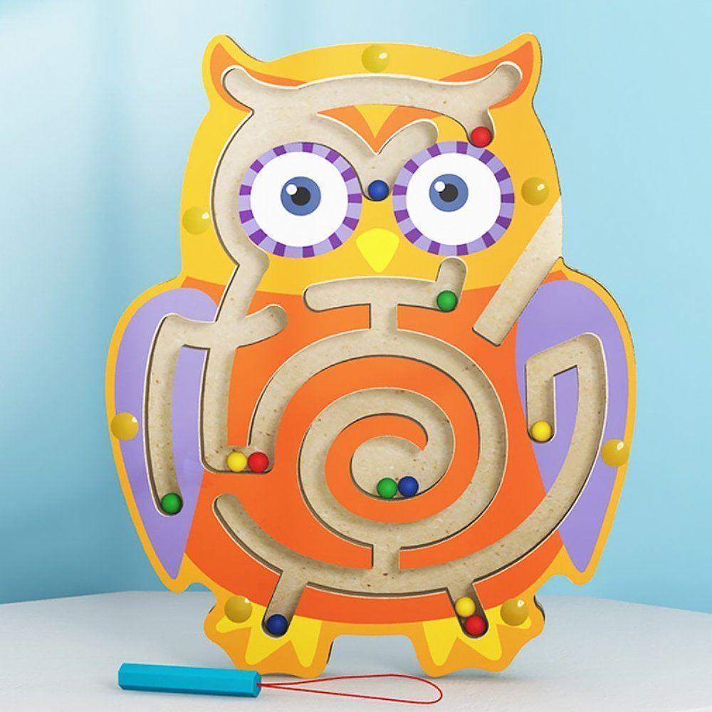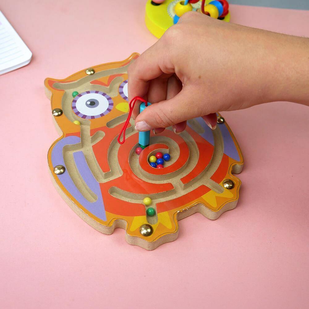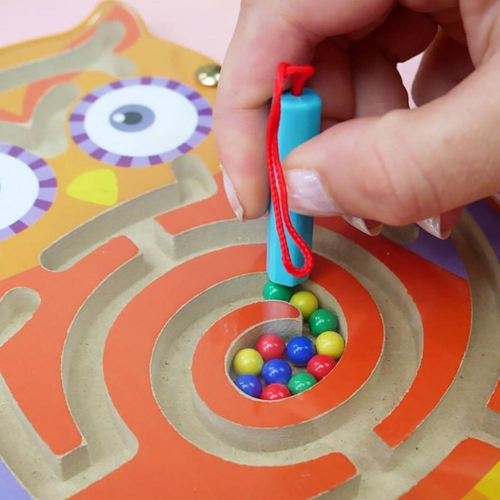 A mágneses labirintus tökéletes fejtörő a gyerekek számára. Vidám állatfigurákban készült, és szinte minden színnel játszik. Gyermekedet az első pillanattól megigézi majd! Azonban a játék igazi szórakozás csak ekkor kezdődik! A gyerekeknek meg kell próbálniuk a mágneses toll segítségével mozgatni a golyókat a labirintusban. A játék során fejlesztik a motorikát és a logikus gondolkodást. A játék szabályait maguk határozhatják meg. Vagy a golyókat szín szerint válogathatják, vagy időre versenyezhetnek. A különböző golyómozgatással megtanulnak problémákat megoldani és jól koncentrálni. És mindez anélkül, hogy unalmas és kényszerű lenne! Segítsd a gyerekeket, hogy felpörögjön az agyuk és fejlesszék az ügyes kezüket! A gyerekeknek a faanyag is tetszeni fog, mely a labirintusnak természetes karaktert kölcsönöz.