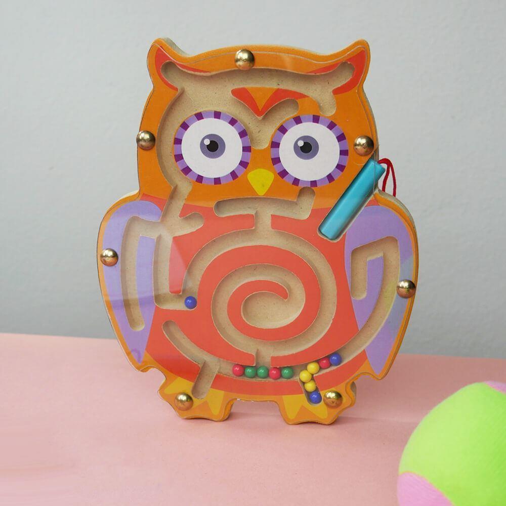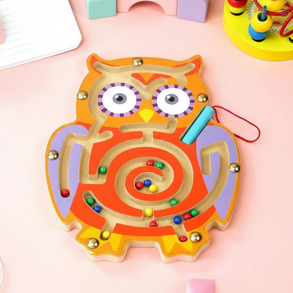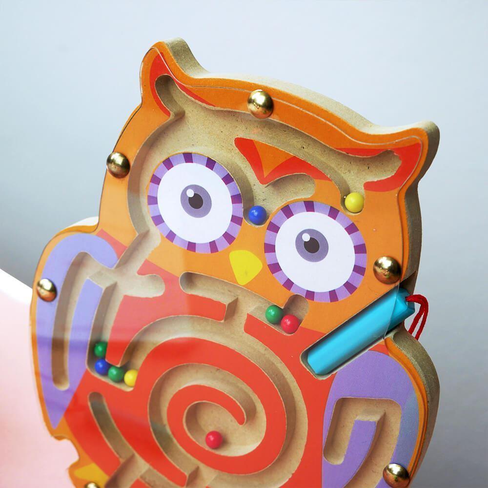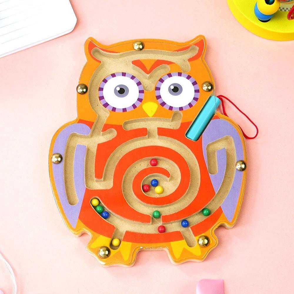 A mágneses labirintus tökéletes fejtörő a gyerekek számára. Vidám állatfigurákban készült, és szinte minden színnel játszik. Gyermekedet az első pillanattól megigézi majd! Azonban a játék igazi szórakozás csak ekkor kezdődik! A gyerekeknek meg kell próbálniuk a mágneses toll segítségével mozgatni a golyókat a labirintusban. A játék során fejlesztik a motorikát és a logikus gondolkodást. A játék szabályait maguk határozhatják meg. Vagy a golyókat szín szerint válogathatják, vagy időre versenyezhetnek. A különböző golyómozgatással megtanulnak problémákat megoldani és jól koncentrálni. És mindez anélkül, hogy unalmas és kényszerű lenne! Segítsd a gyerekeket, hogy felpörögjön az agyuk és fejlesszék az ügyes kezüket! A gyerekeknek a faanyag is tetszeni fog, mely a labirintusnak természetes karaktert kölcsönöz.