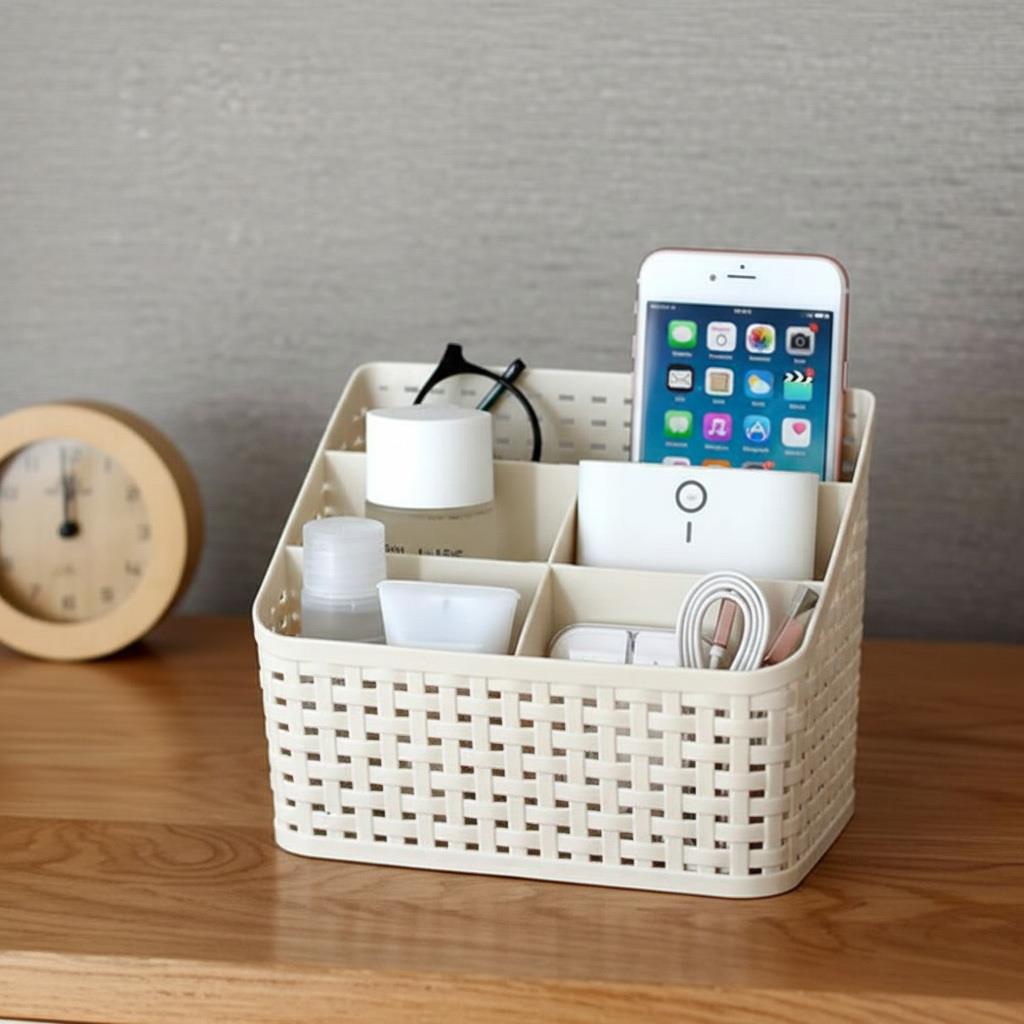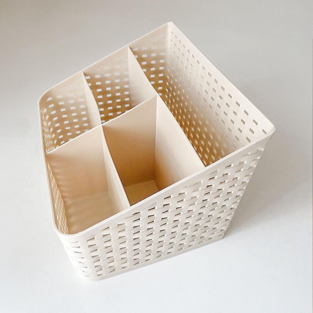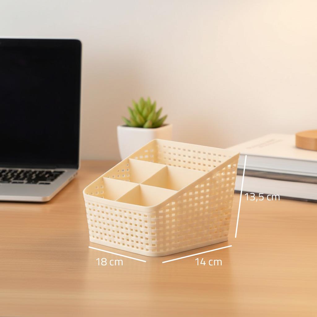 A rattan stílusú szervező nemcsak a fürdőszobába, hanem kiváló kiegészítő az íróasztalra is, mint tolltartó. Dísze lehet az éjjeliszekrénynek is, ahová elhelyezheti a mobiltelefonját, szemüvegét vagy kézkrémét.
