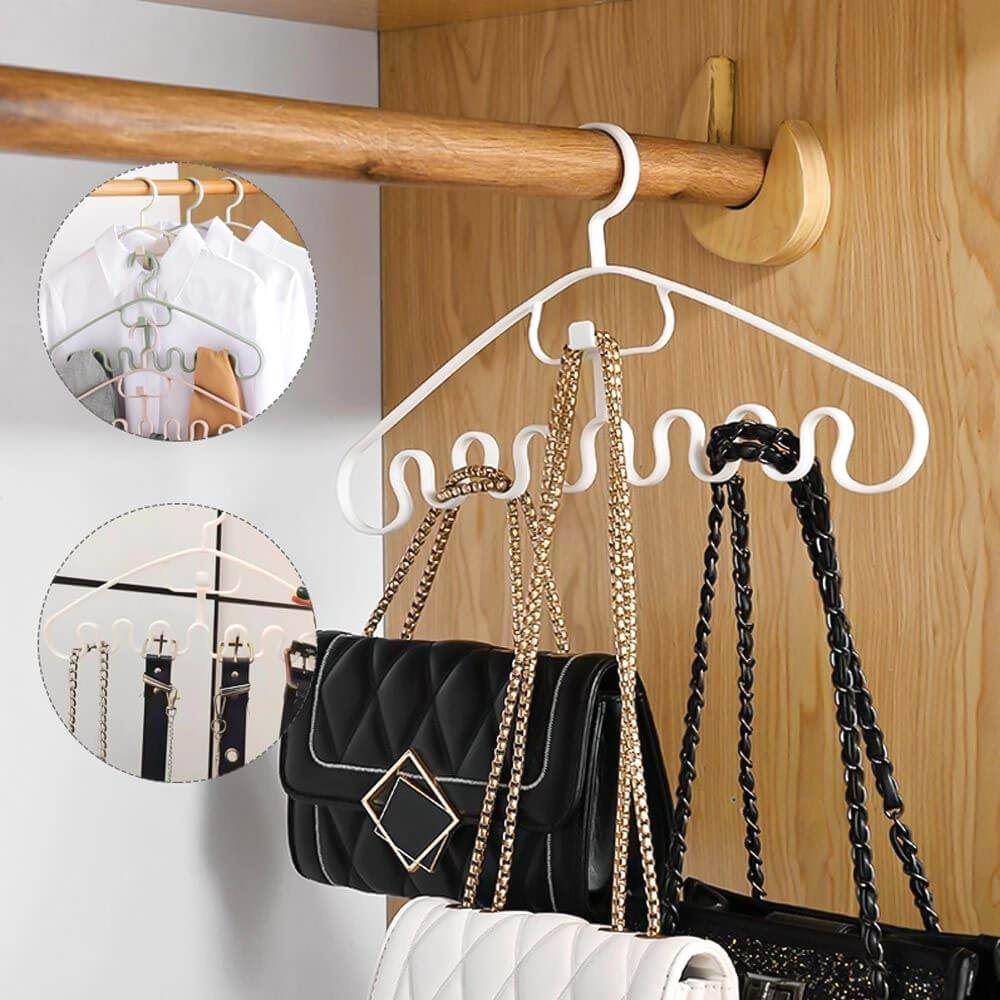A hajlatokkal ellátott fogassal mindig átláthatóan rendszerezheti, hol vannak sáljai, övei és más, erre akasztható ruhadarabjai. Szokatlan, mégis eredeti kialakításának köszönhetően könnyen megtalálja a helyét gardróbjában, és helyet spórol a szekrényben.