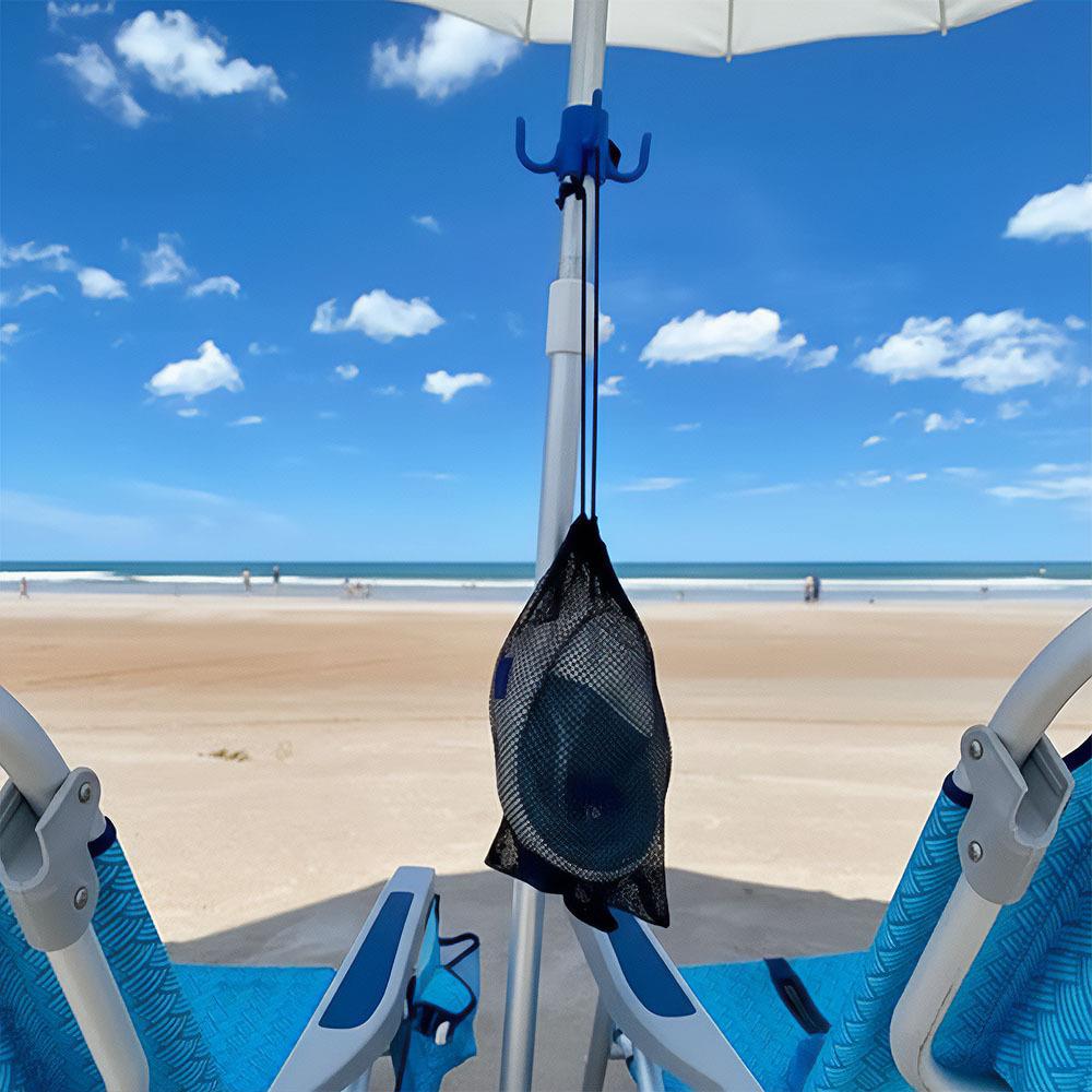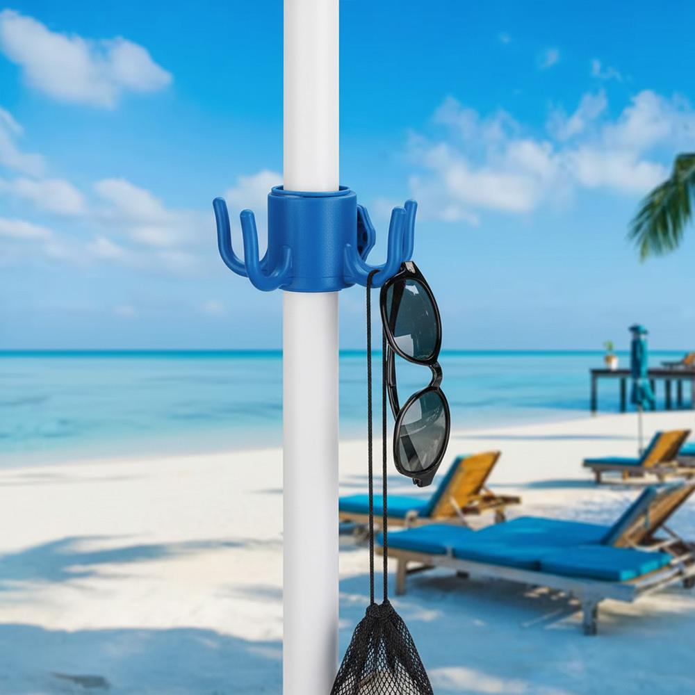 A 4 akasztós napernyőtartó praktikus megoldás, amely rendet teremt a nyugágy körül és a strandon is. Többé nem lesznek törölközők a homokban, vizes táskák a földön vagy eltévedt szemüvegek és kulcsok a pléden – csak akassza fel őket az akasztóra, és minden átláthatóan kéznél lesz.