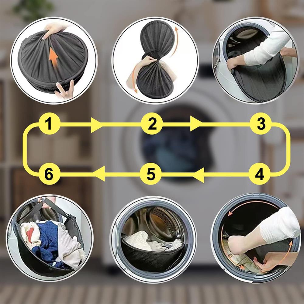 A mosógépből való gyors ruhakivételhez való zsák szenzációs találmány, mivel nem kell egyenként kihúznia a mosógép tartalmát. Háziasszonyként így értékes időt és idegeket spórol meg. A zsák fülei lehetővé teszik, hogy a tartalommal együtt kényelmesen átszállítsa a szárítógépbe vagy a szárítóra. A zsák összecsukható, és használaton kívül fel is akasztható.