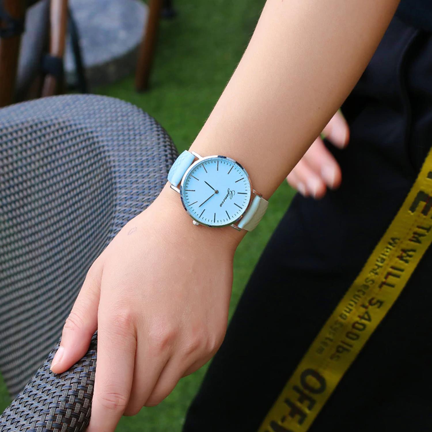 Az alap szíj színe világos bézs, de napsütés hatására gyönyörű pasztellkékre változik.