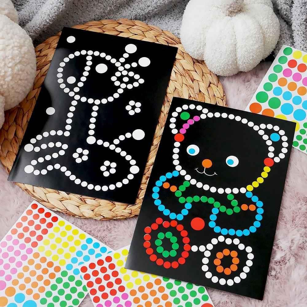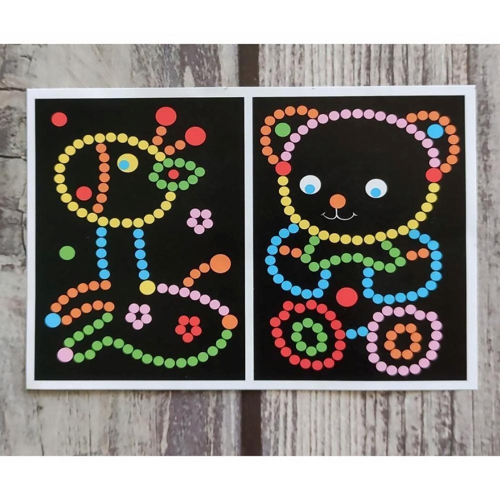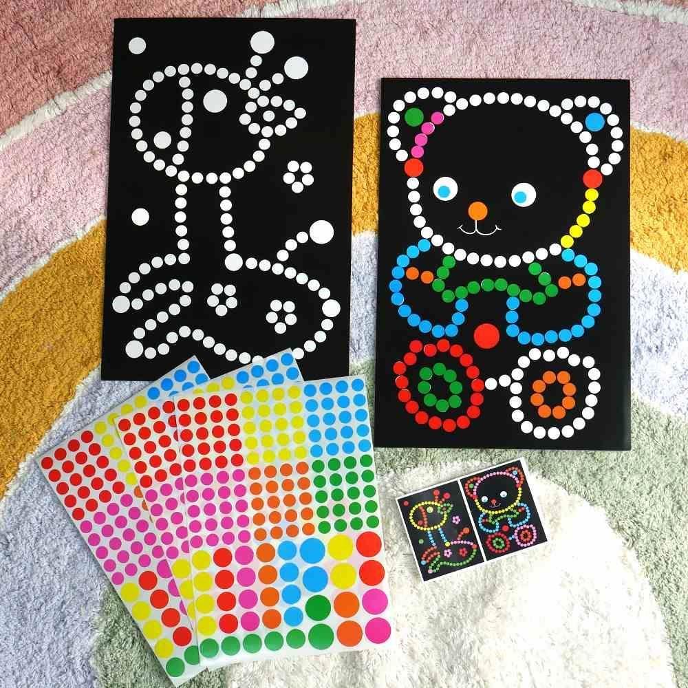 A ragasztás fejleszti a gyerekek finom motorikus képességeit és az aprólékossággal összekapcsolt türelmet, ami az életben mindenképpen hasznukra válik. A színes pontok ráadásul segítik a színek észlelését, megkülönböztetését, valamint a fantázia önmagában is fejlődik általuk.
