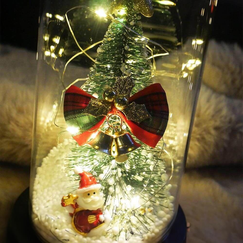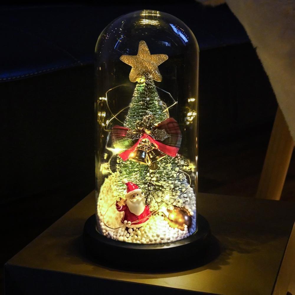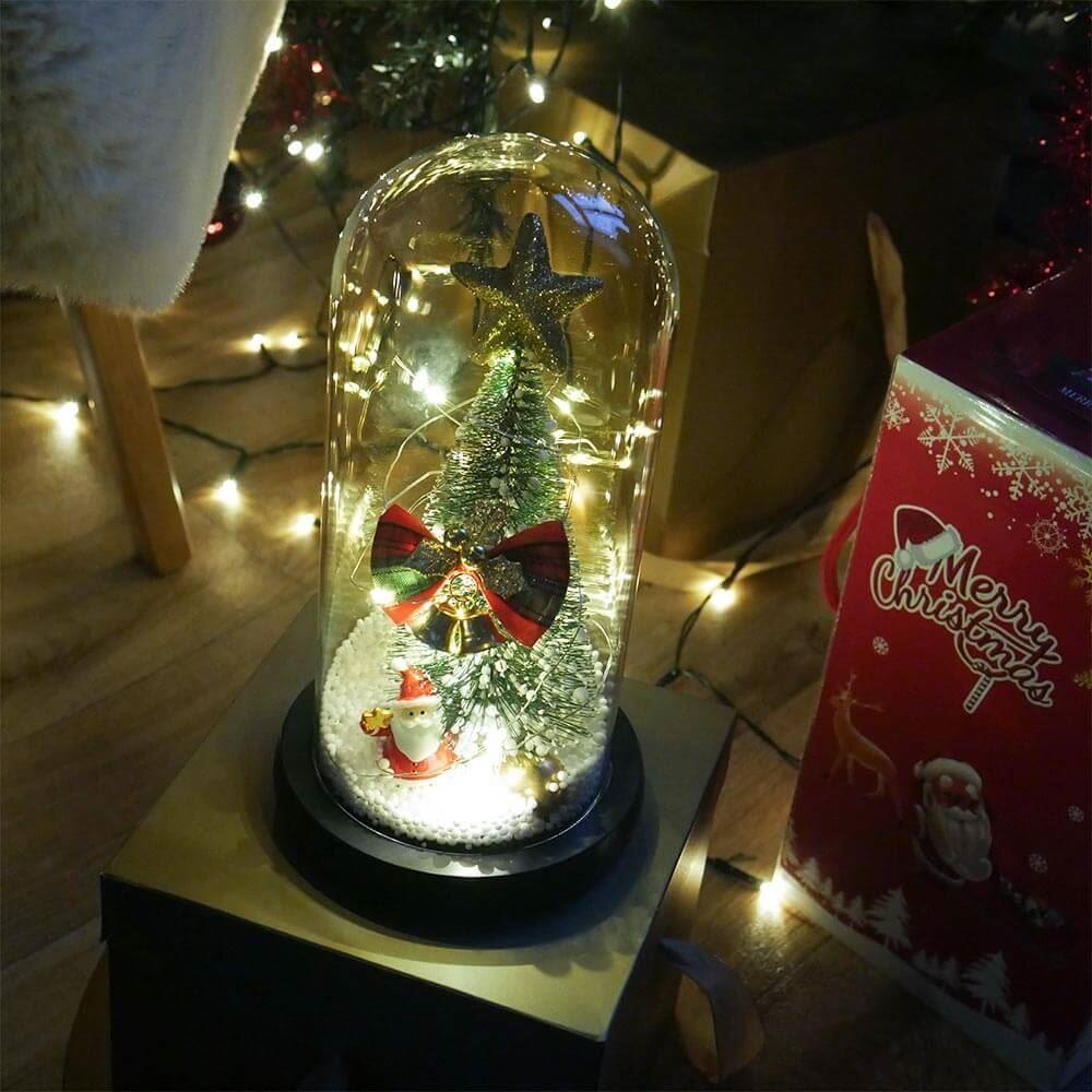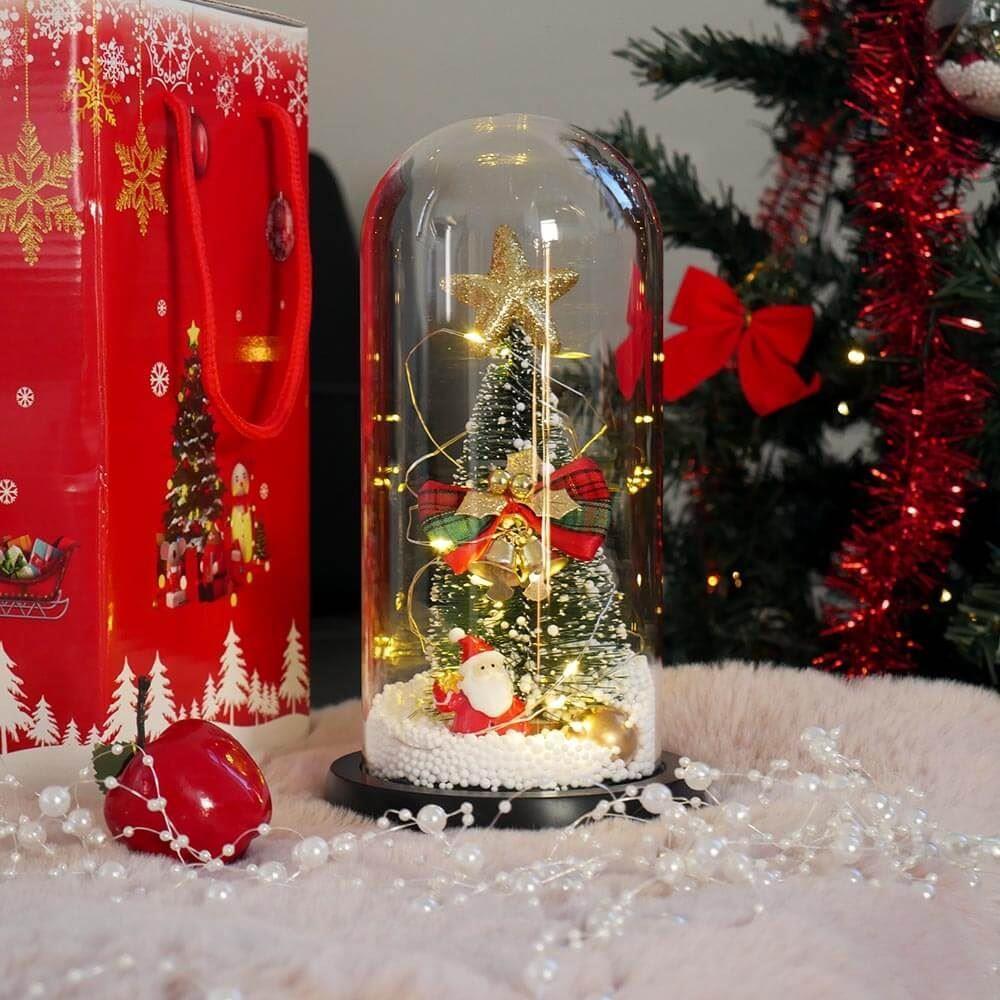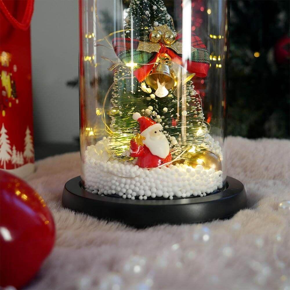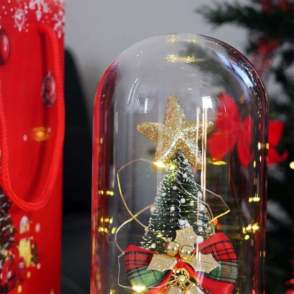 Világító karácsonyfa üveg vázában, ajándékcsomagolásban