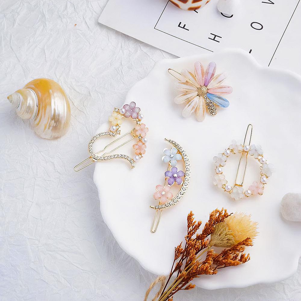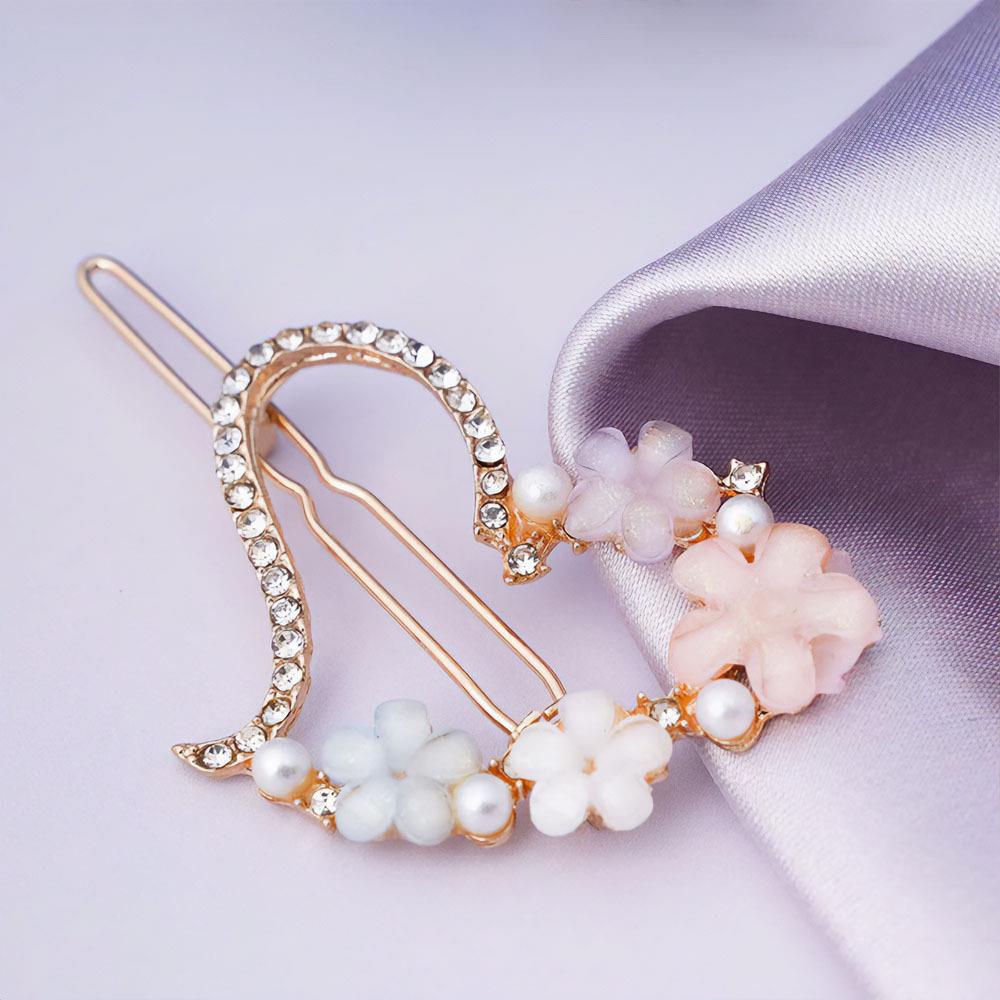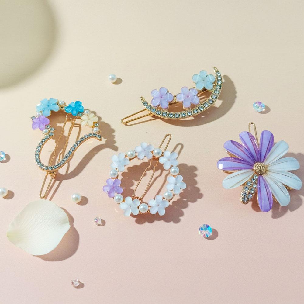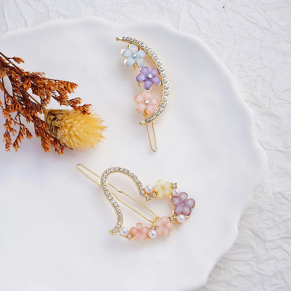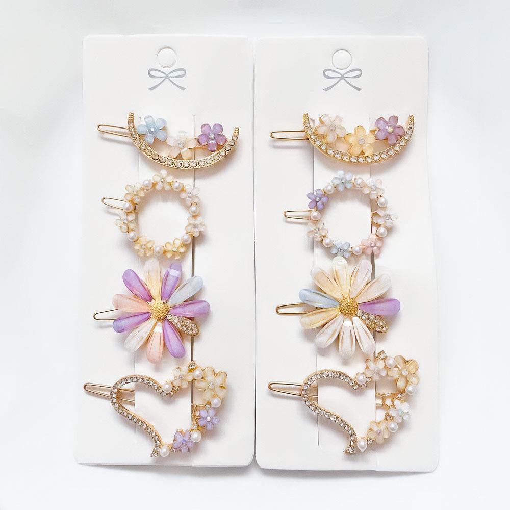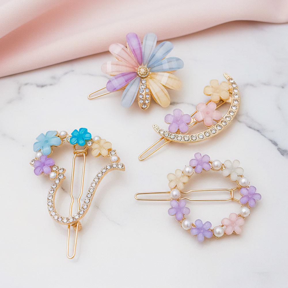 Négy darabos, virágos, kövekkel díszített hajcsat szettünk finom és elegáns kiegészítő, amely egyedivé varázsolja a frizurát. Minden csat más formájú – találsz köztük díszes szívecskét, holdacskát, virágkoszorút és pasztell margarétát is.